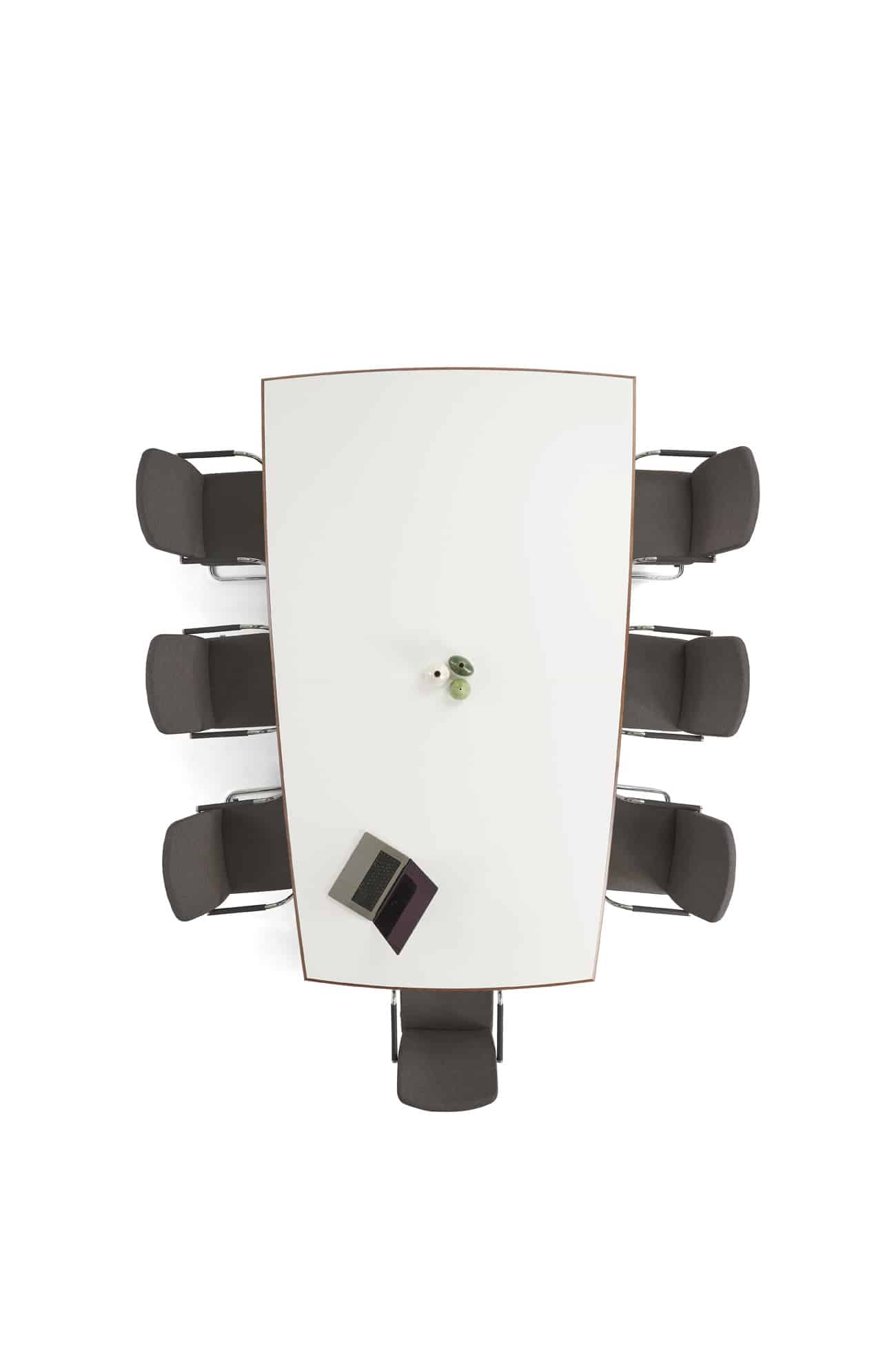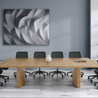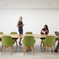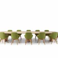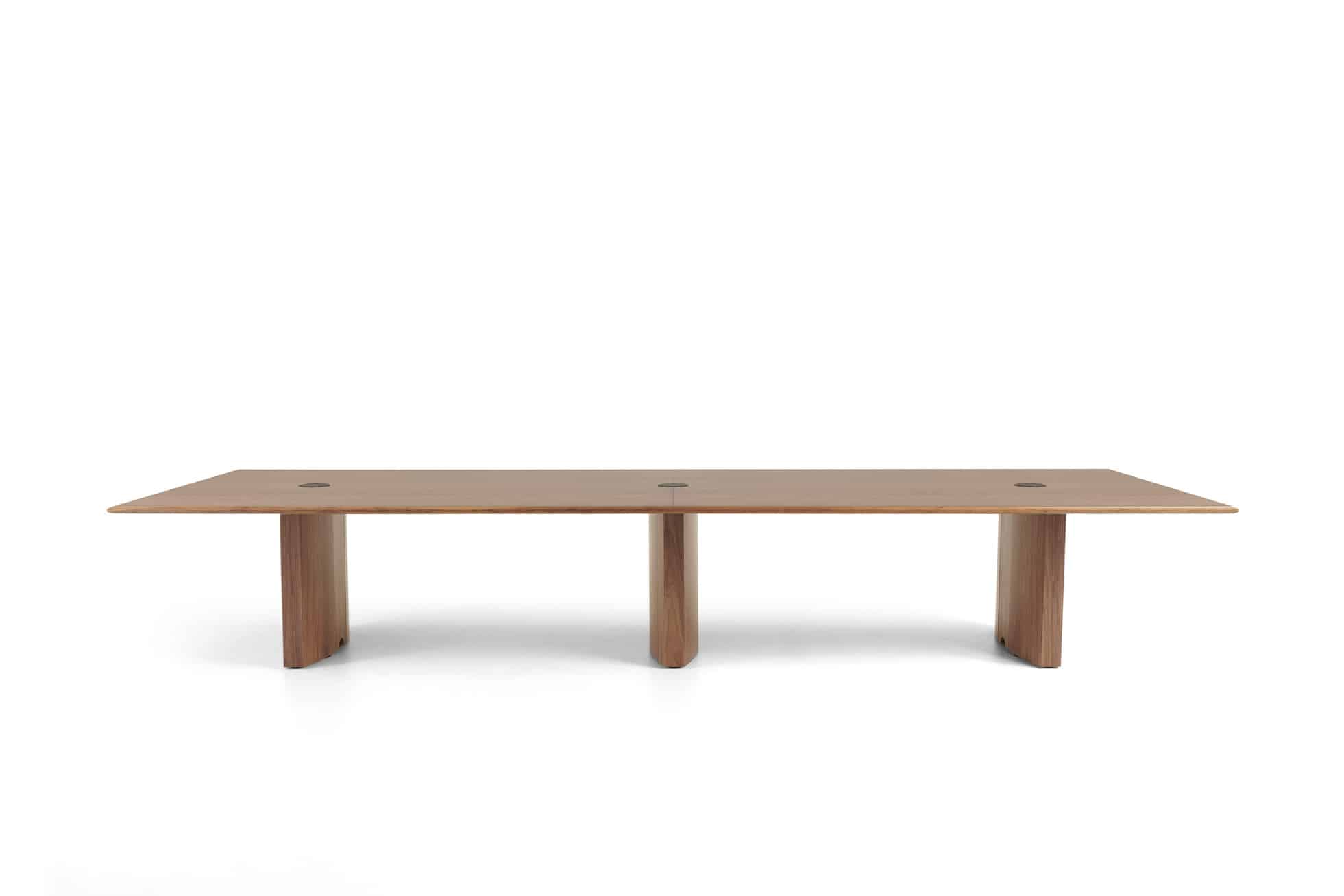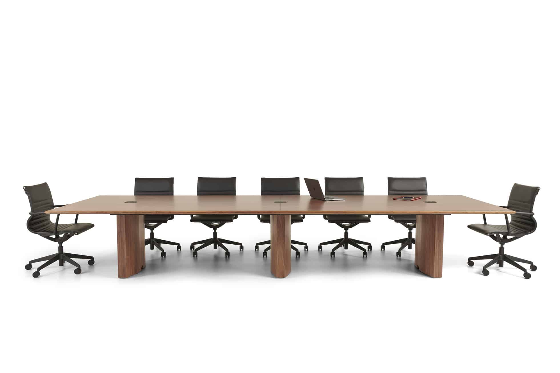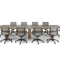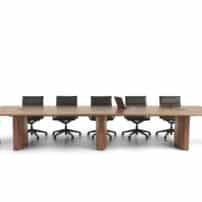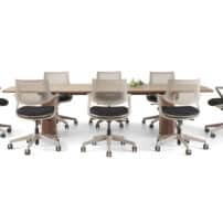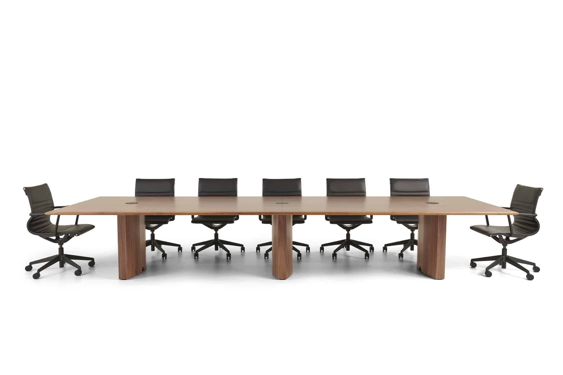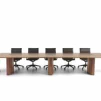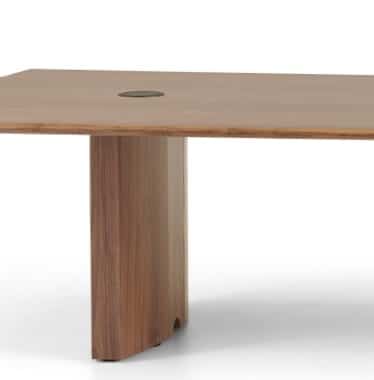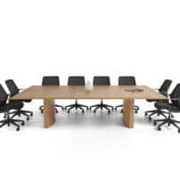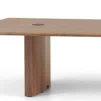 Carefully crafted using the finest materials, the aerofoil table collection combines elegance and functionality for conference and meeting room solutions. The beautiful aerofoil shaped table legs both provide the stability for these architectural furniture pieces and also provide a simple cable management system through a discreet lift-off panel on the inside face of the curved and veneered leg, allowing power modules to be placed directly over the leg frames and the cables to be easily managed vertically. Run your hands over the table tops which are finished with real wood veneer, or nano-laminate over solid wood lippings and a ‘bullet’ edge profile, and you can appreciate not only its undeniable design excellence, but its meticulous craftsmanship and longevity.