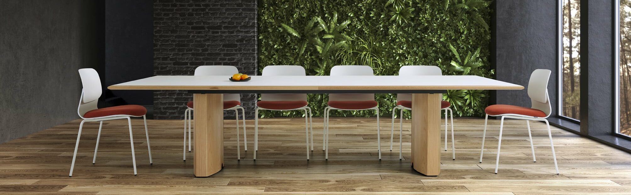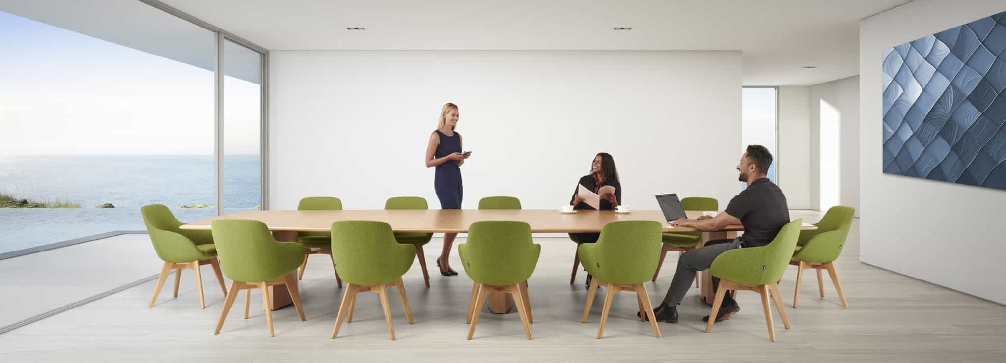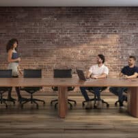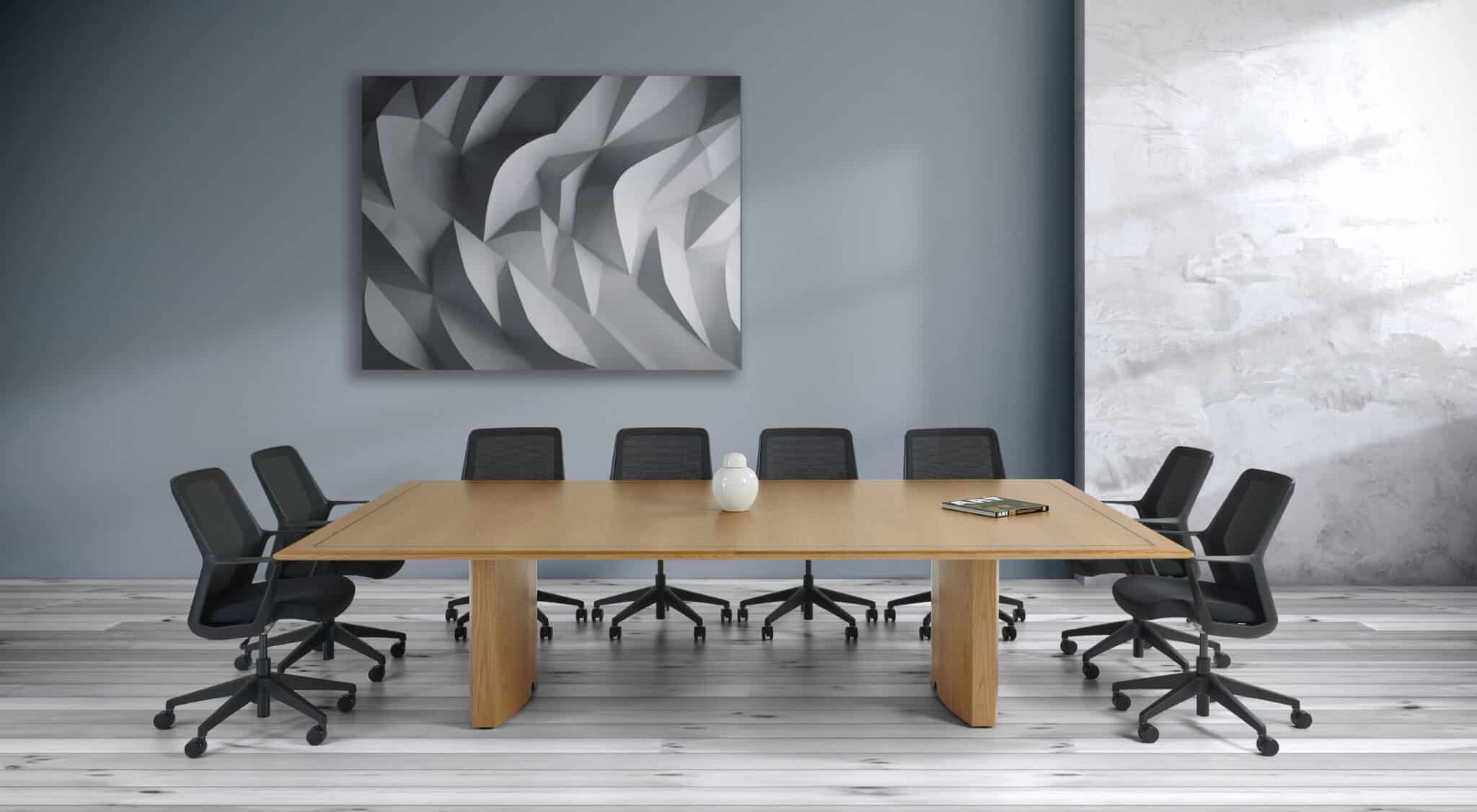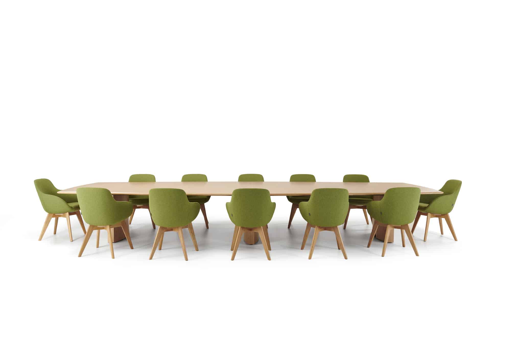 Carefully crafted using the finest materials, the aerofoil table collection combines elegance and functionality for conference and meeting room solutions. The beautiful aerofoil shaped table legs both provide the stability for these architectural furniture pieces and also provide a simple cable management system through a discreet lift-off panel on the inside face of the curved and veneered leg, allowing power modules to be placed directly over the leg frames and the cables to be easily managed vertically. Run your hands over the table tops which are finished with real wood veneer, or nano-laminate over solid wood lippings and a ‘bullet’ edge profile, and you can appreciate not only its undeniable design excellence, but its meticulous craftsmanship and longevity.