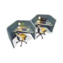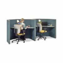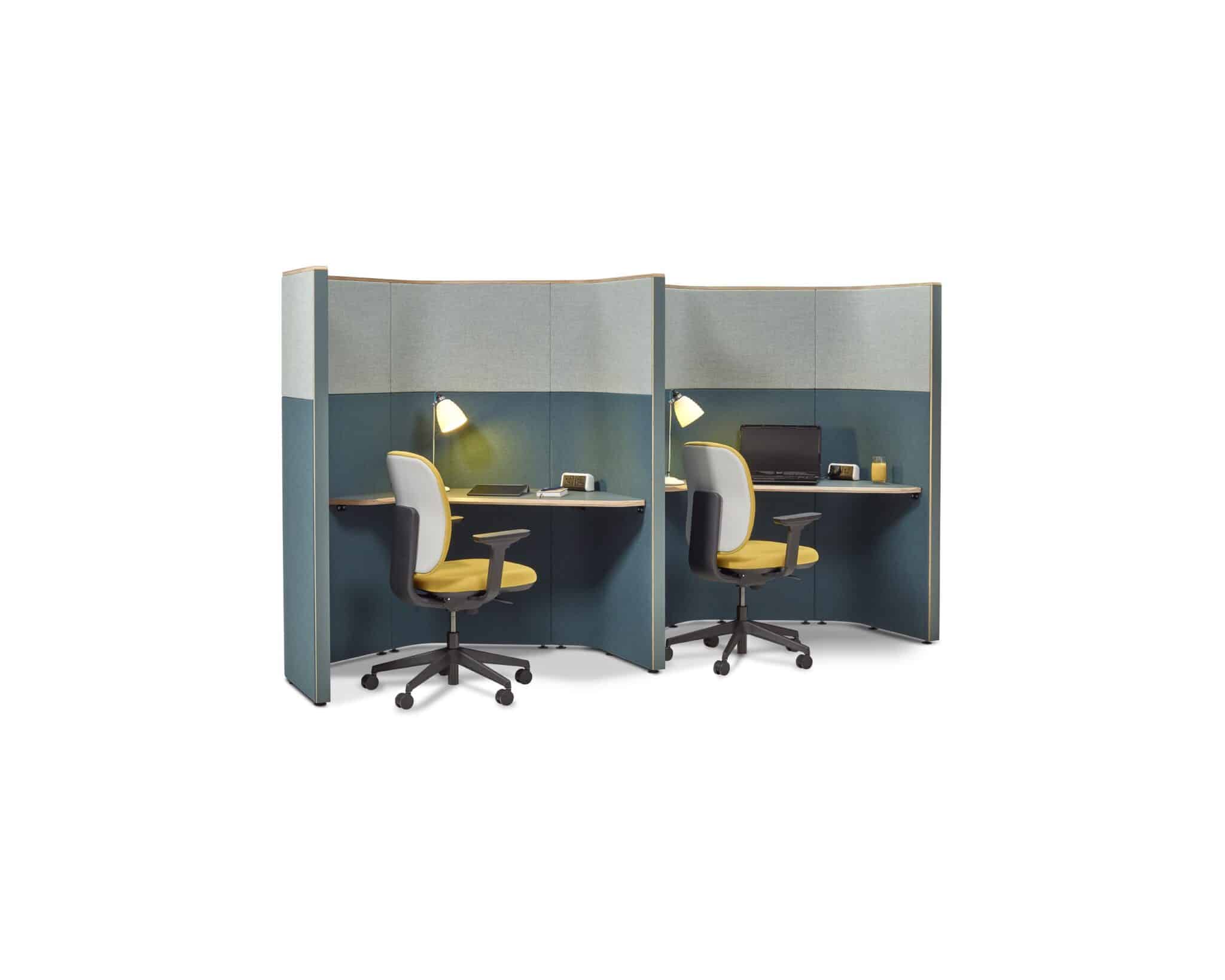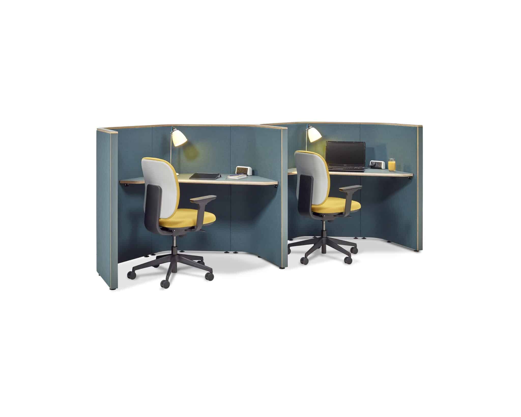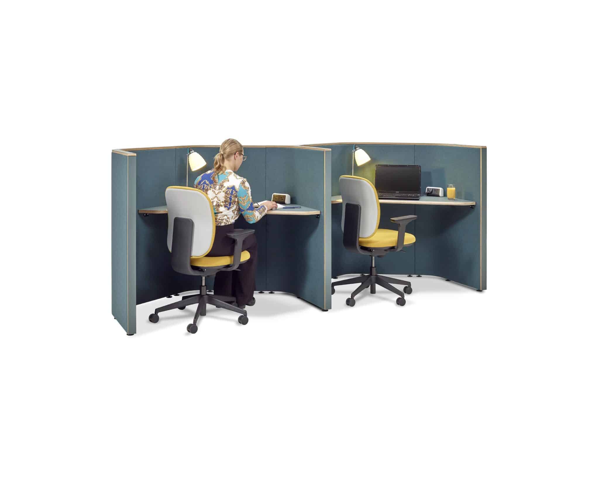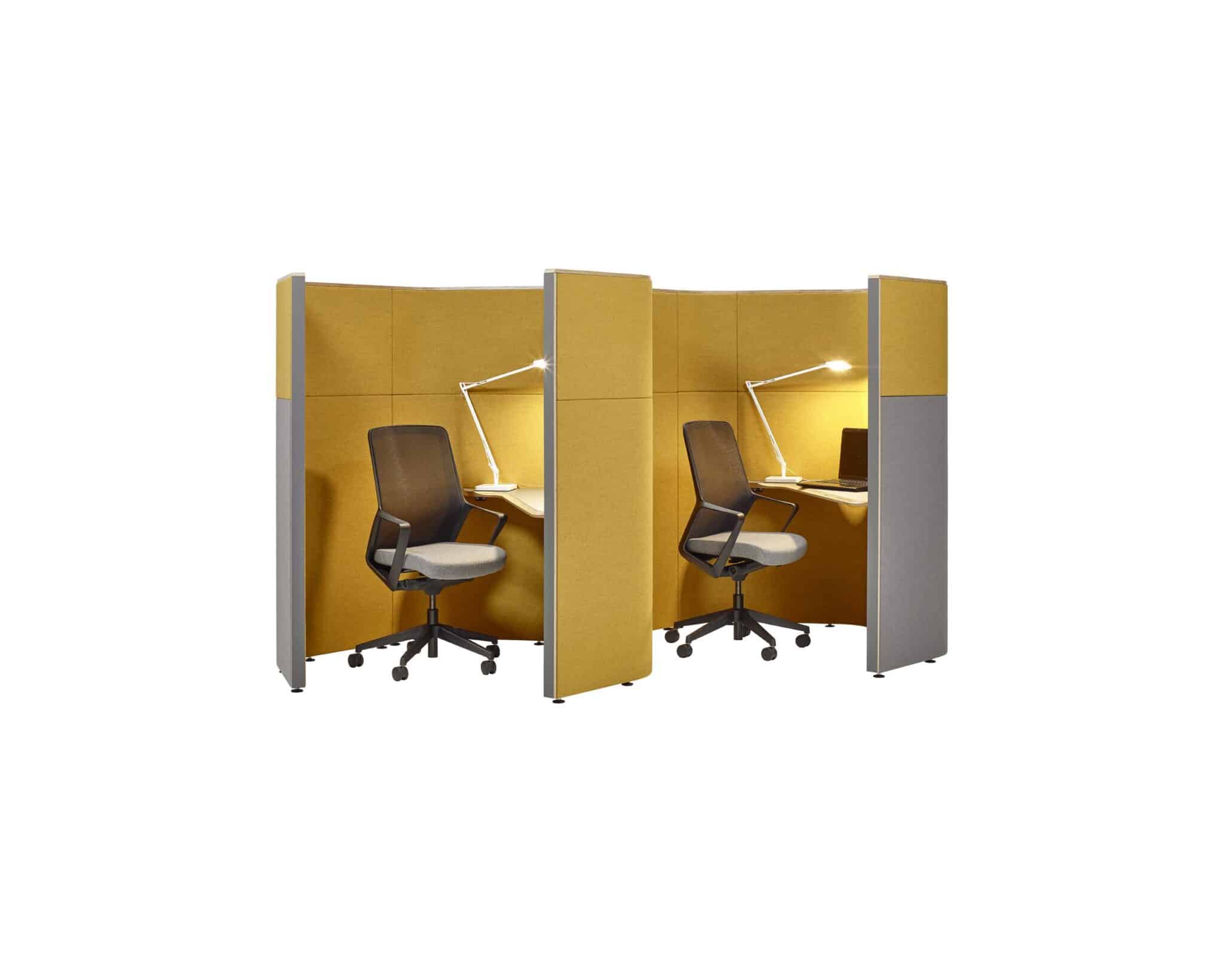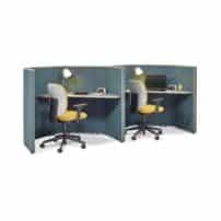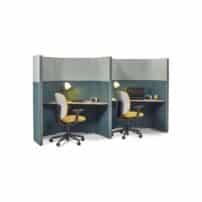 BWB 2 – a double, upholstered ‘in-line’ work booths, with an MFC finish, ergonomically-shaped worktop and with top and end caps in polished plywood with a nano-tech laminate surface finish – with a medium panel height or with a high panel height