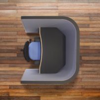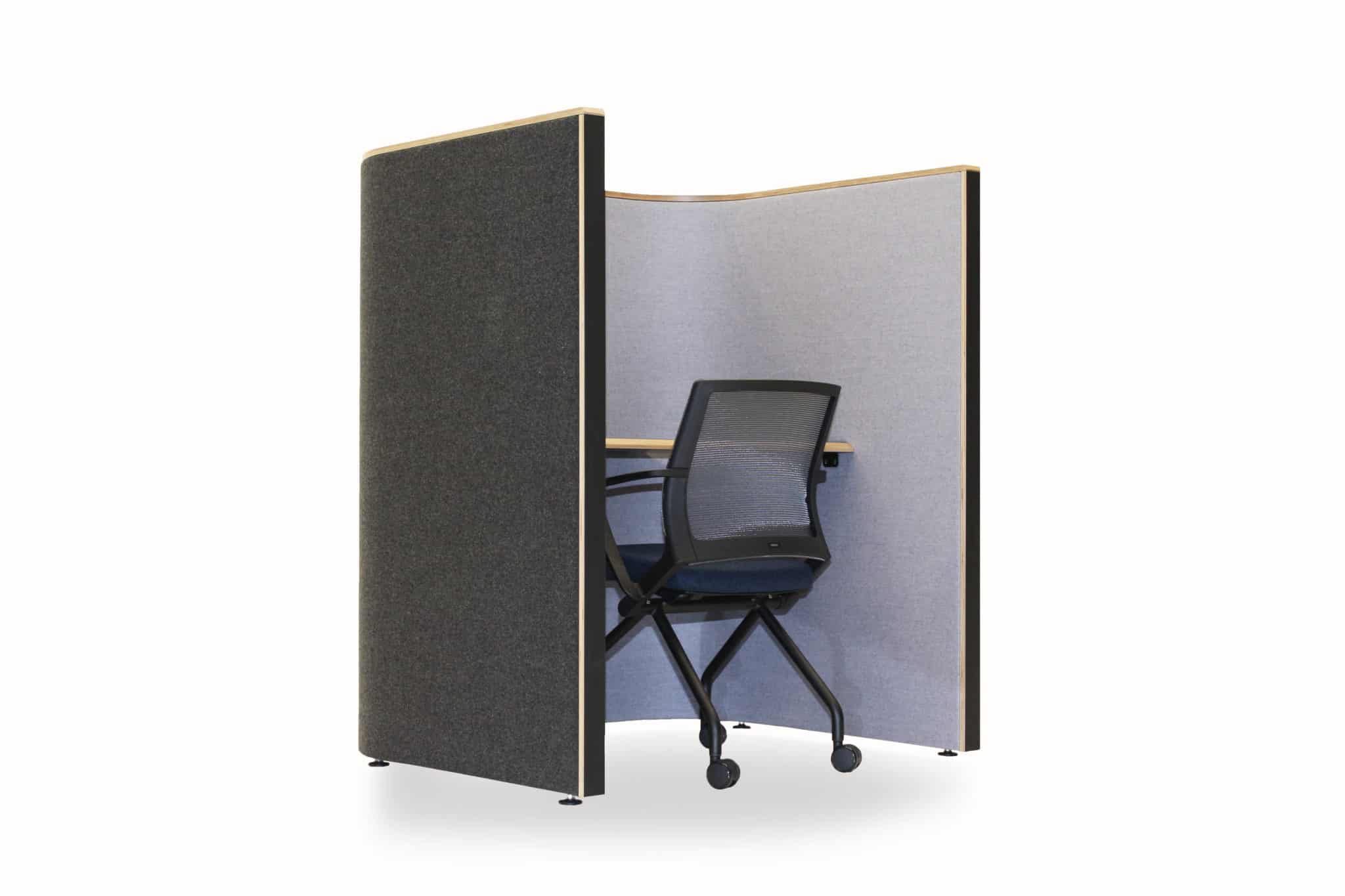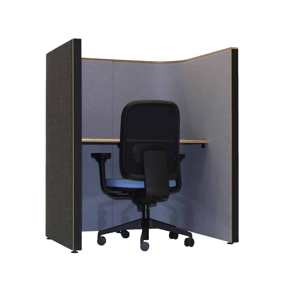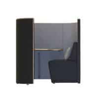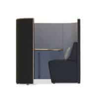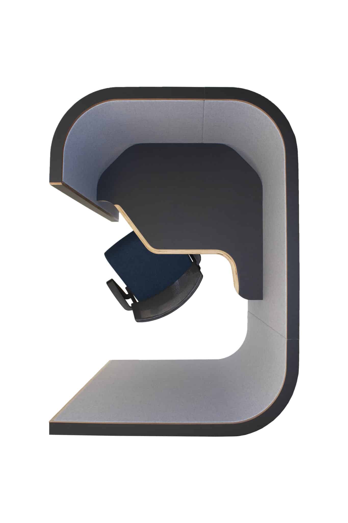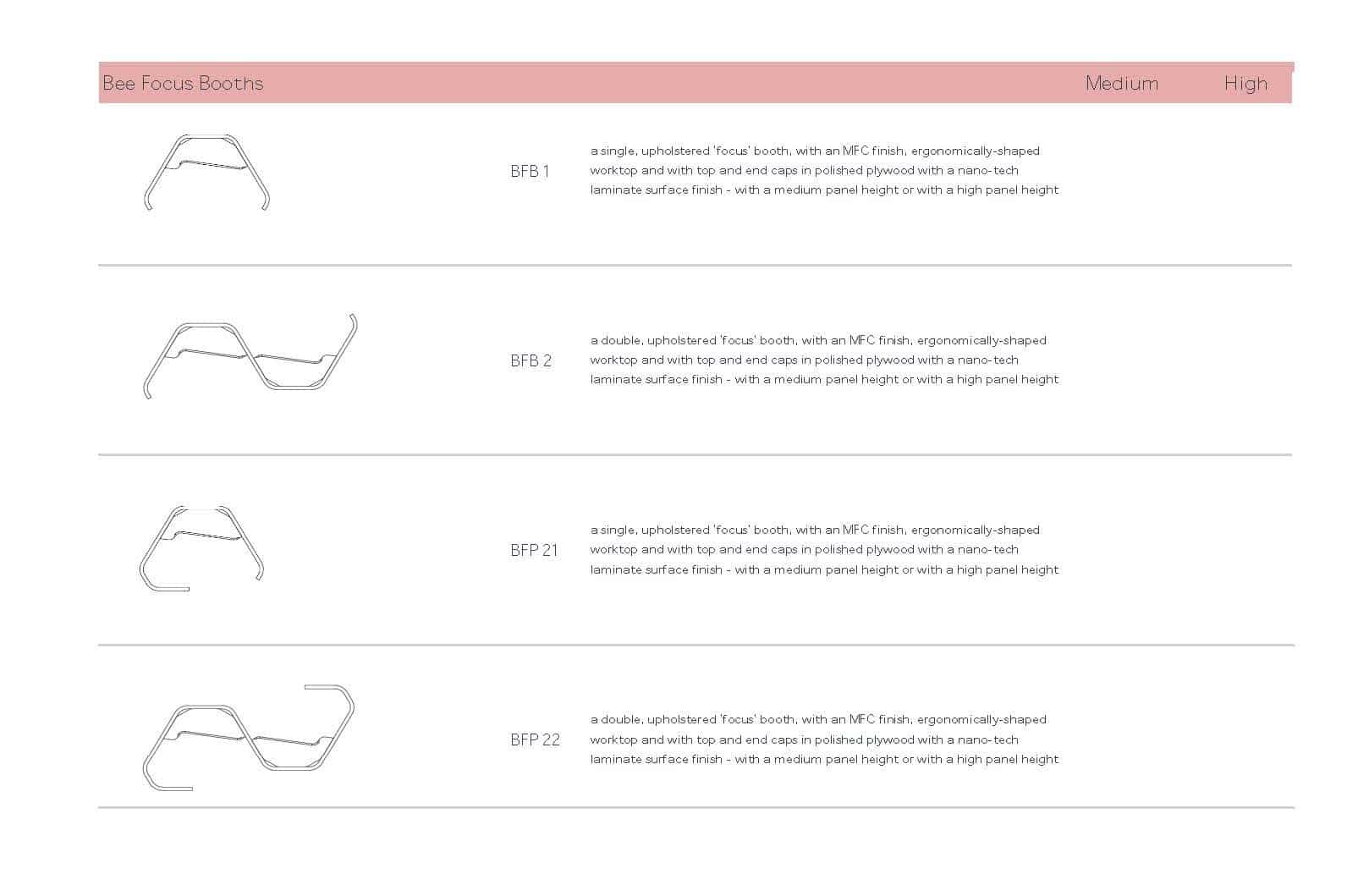 BFB 1 – a single upholstered ‘focus’ booth, with an MFC finish, ergonomically-shaped worktop and with top and end caps in polished plywood with a nano-tech laminate surface finish – with a medium panel height or with a high panel height