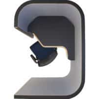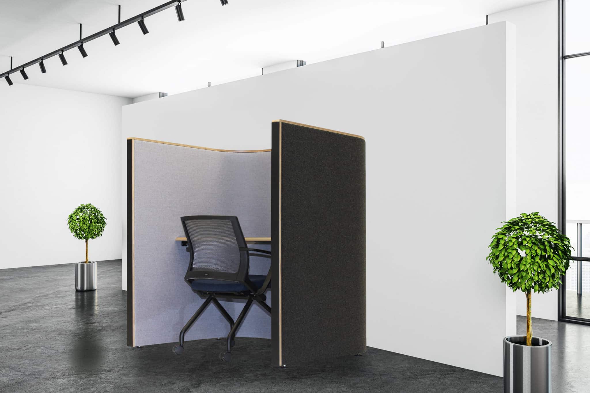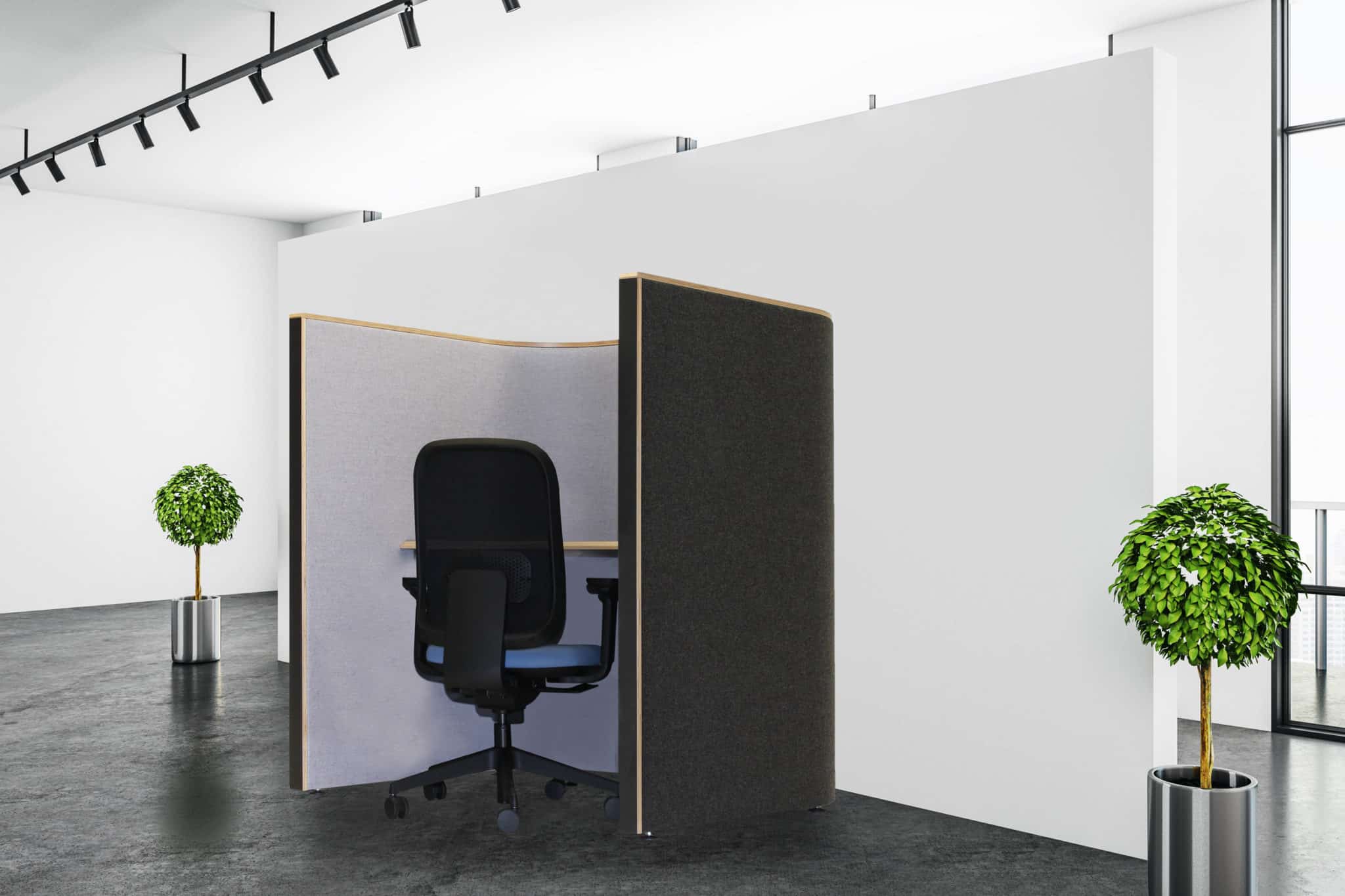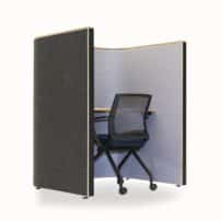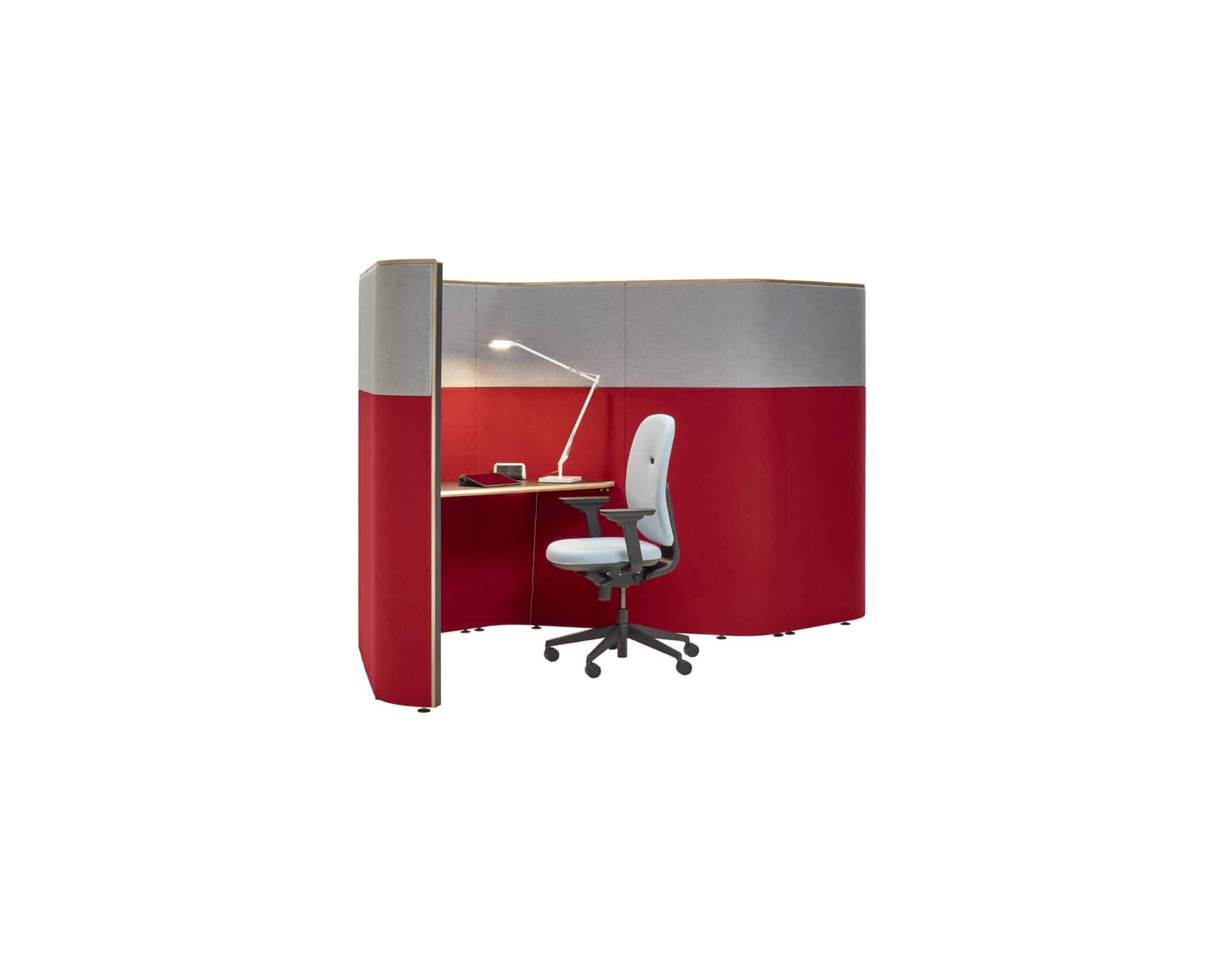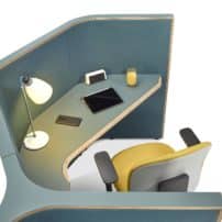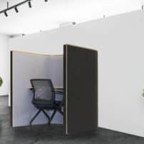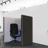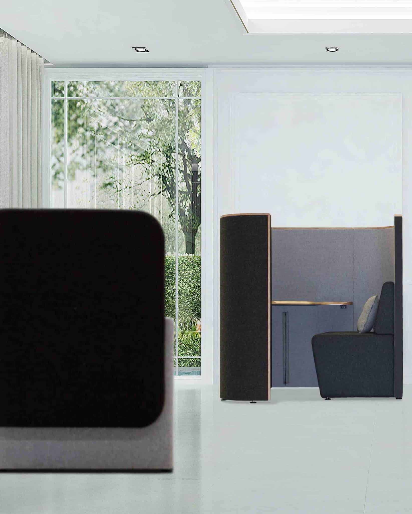 BFB 1 – a single upholstered ‘focus’ booth, with an MFC finish, ergonomically-shaped worktop and with top and end caps in polished plywood with a nano-tech laminate surface finish – with a medium panel height or with a high panel height