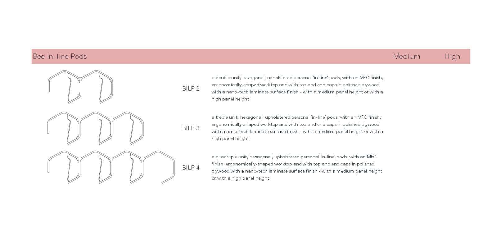 BILP 4 – a quadruple unit, hexagonal, upholstered personal ‘in-line’ pods, with an MFC finish, ergonomically-shaped worktop and with top and end caps in polished plywood with a nano-tech laminate surface finish – with a medium panel height or with a high panel height