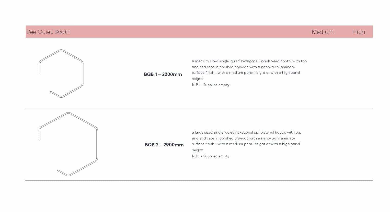 BQB 1 2200 – a medium sized single ‘quiet’ hexagonal upholstered booth, with top and end caps in polished plywood with a nano-tech laminate surface finish – with a medium panel height or with a high panel height N.B. – Supplied empty