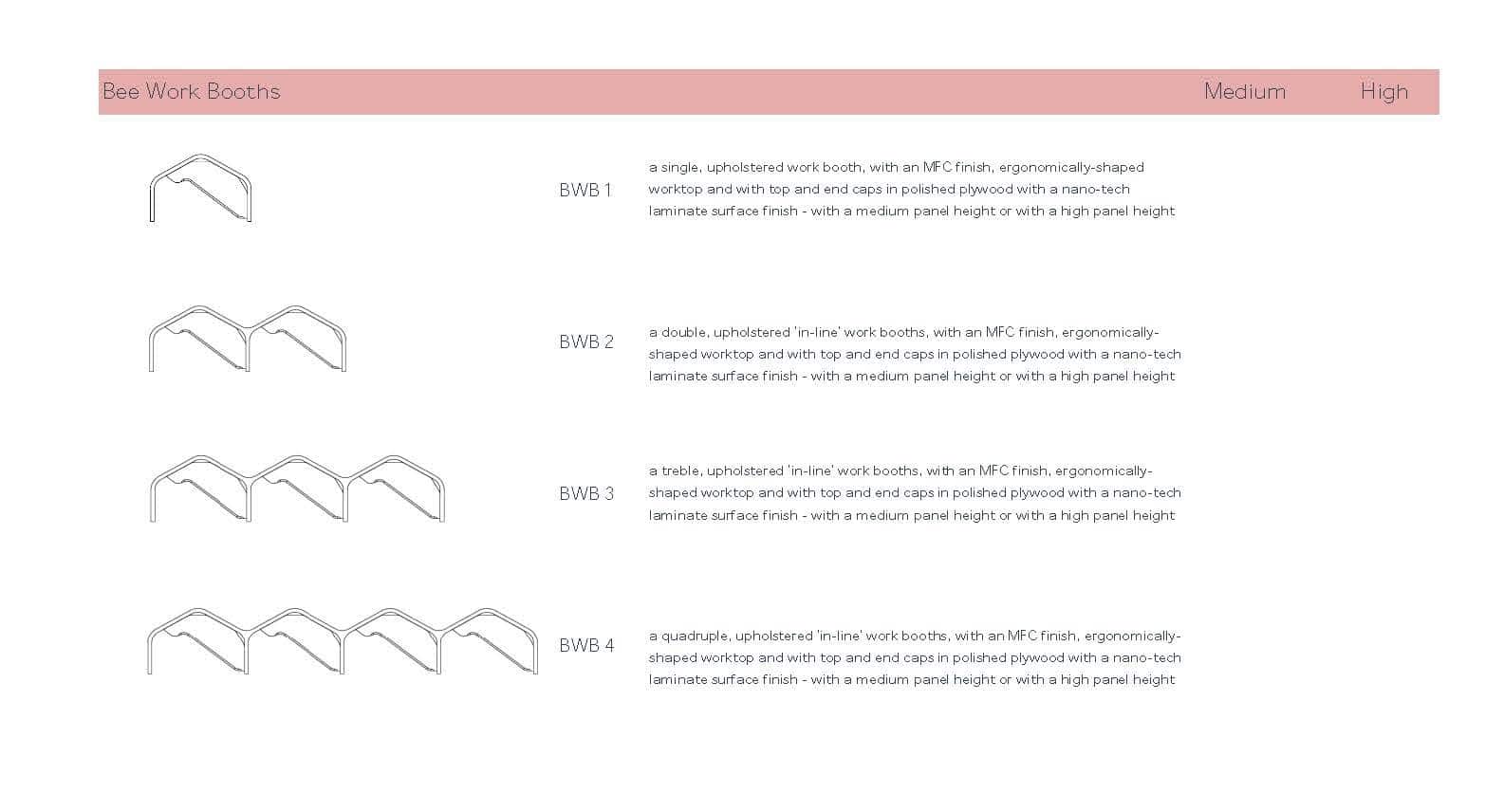 BWB 4 – a quadruple, upholstered ‘in-line’ work booths, with an MFC finish, ergonomically-shaped worktop and with top and end caps in polished plywood with a nano-tech laminate surface finish – with a medium panel height or with a high panel height