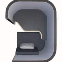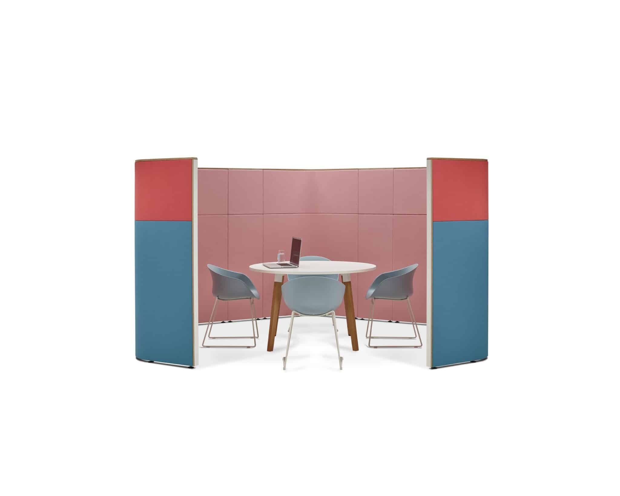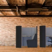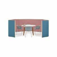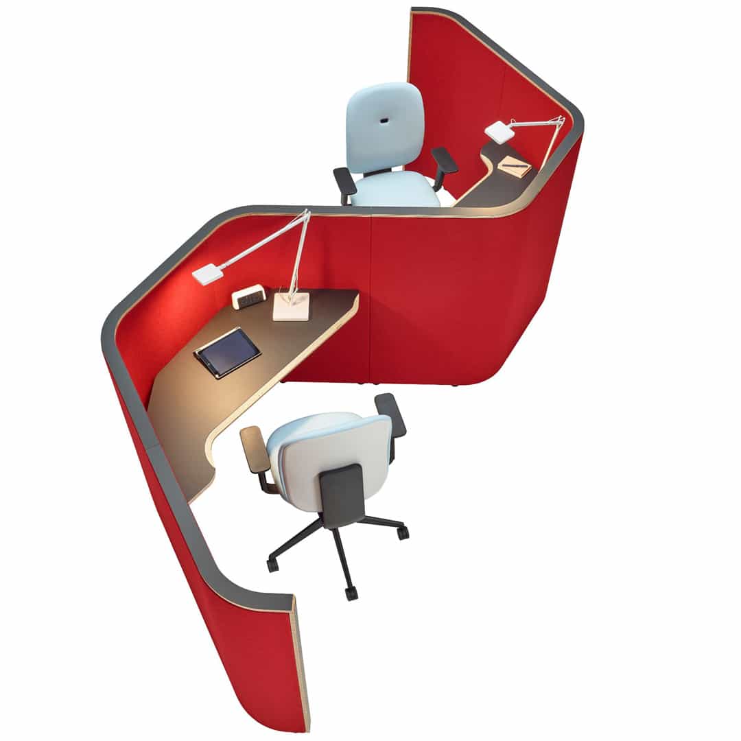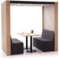 BFB 2- a double, upholstered ‘focus’ booth, with an MFC finish, ergonomically-shaped worktop and with top and end caps in polished plywood with a nano-tech laminate surface finish – with a medium panel height or with a high panel height