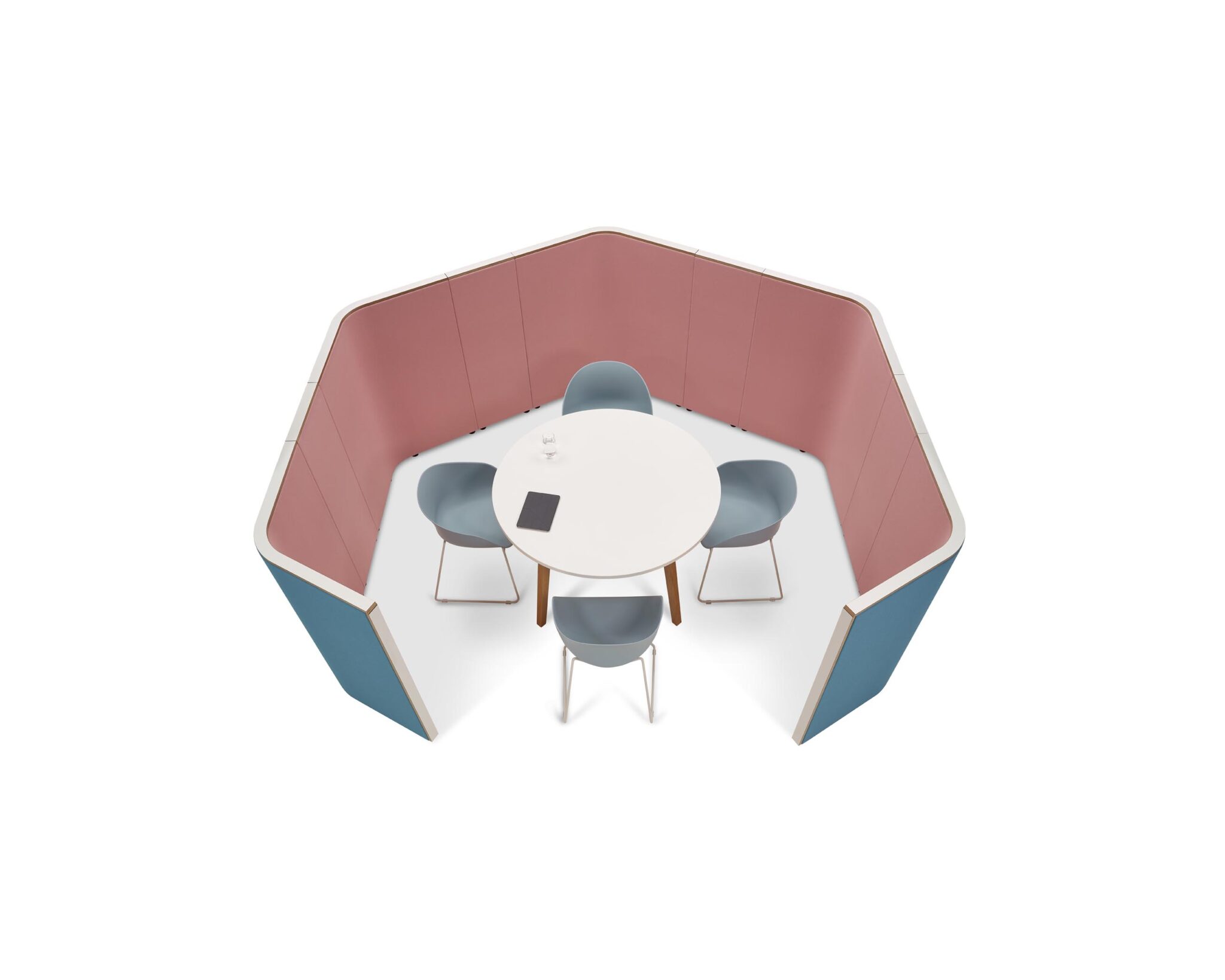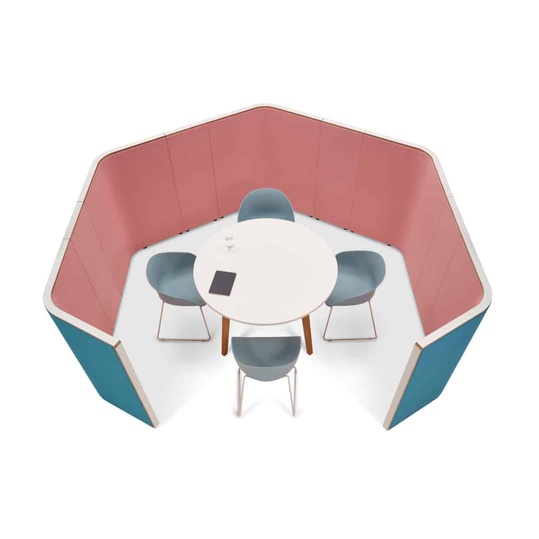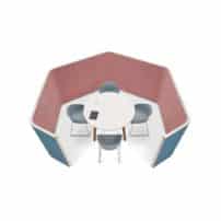 Get in Touch...Hexagonal, upholstered personal 'cluster' pod, with an MFC finish, ergonomically-shaped worktop and with top and end caps in polished plywood with a nano-tech laminate surface finish - with a medium panel height or with a high panel height