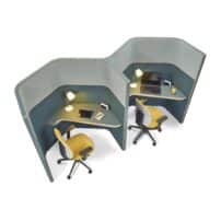 BCP 2 – a double unit, hexagonal, upholstered personal ‘cluster’ pods, with an MFC finish, ergonomically-shaped worktop and with top and end caps in polished plywood with a nano-tech laminate surface finish – with a medium panel height or with a high panel height