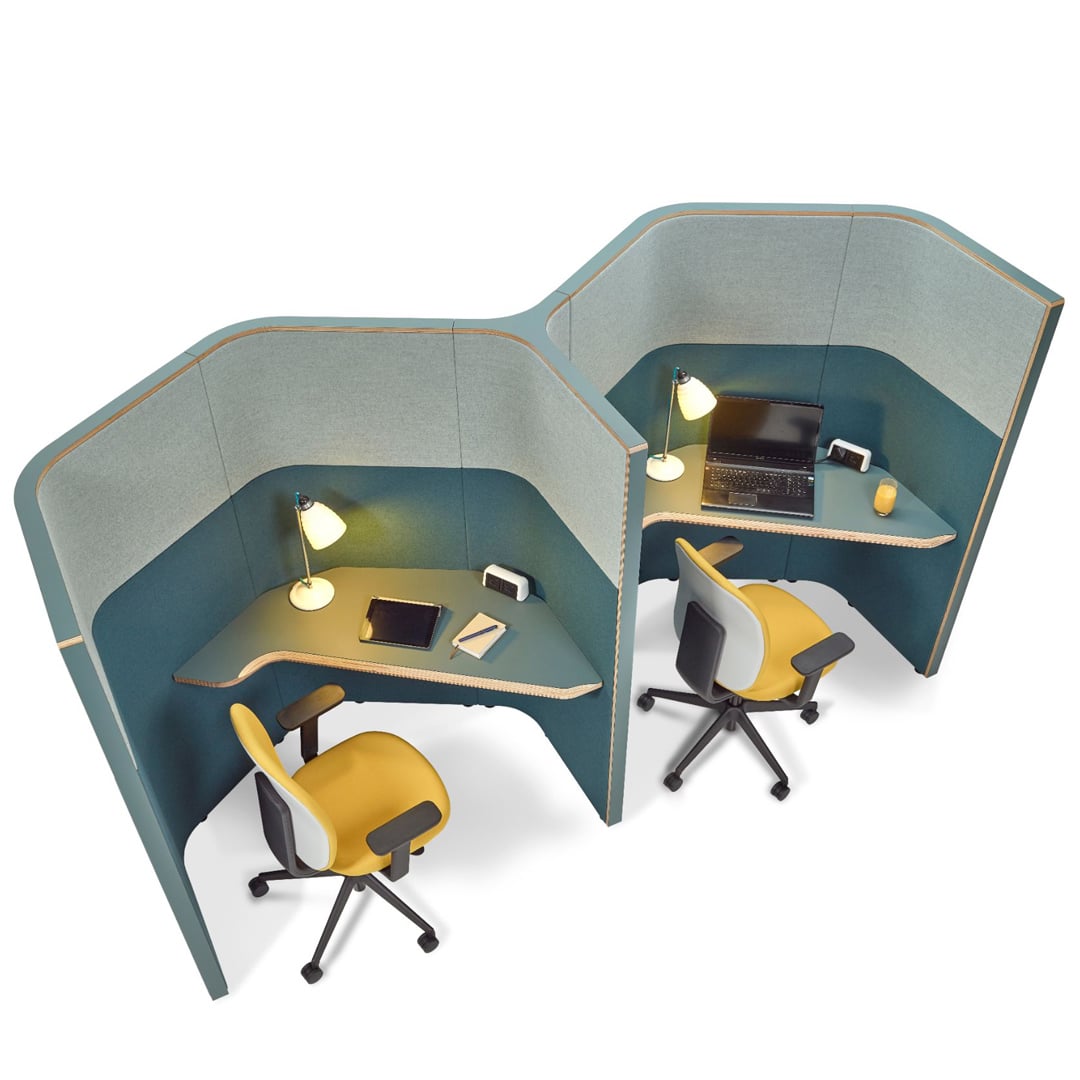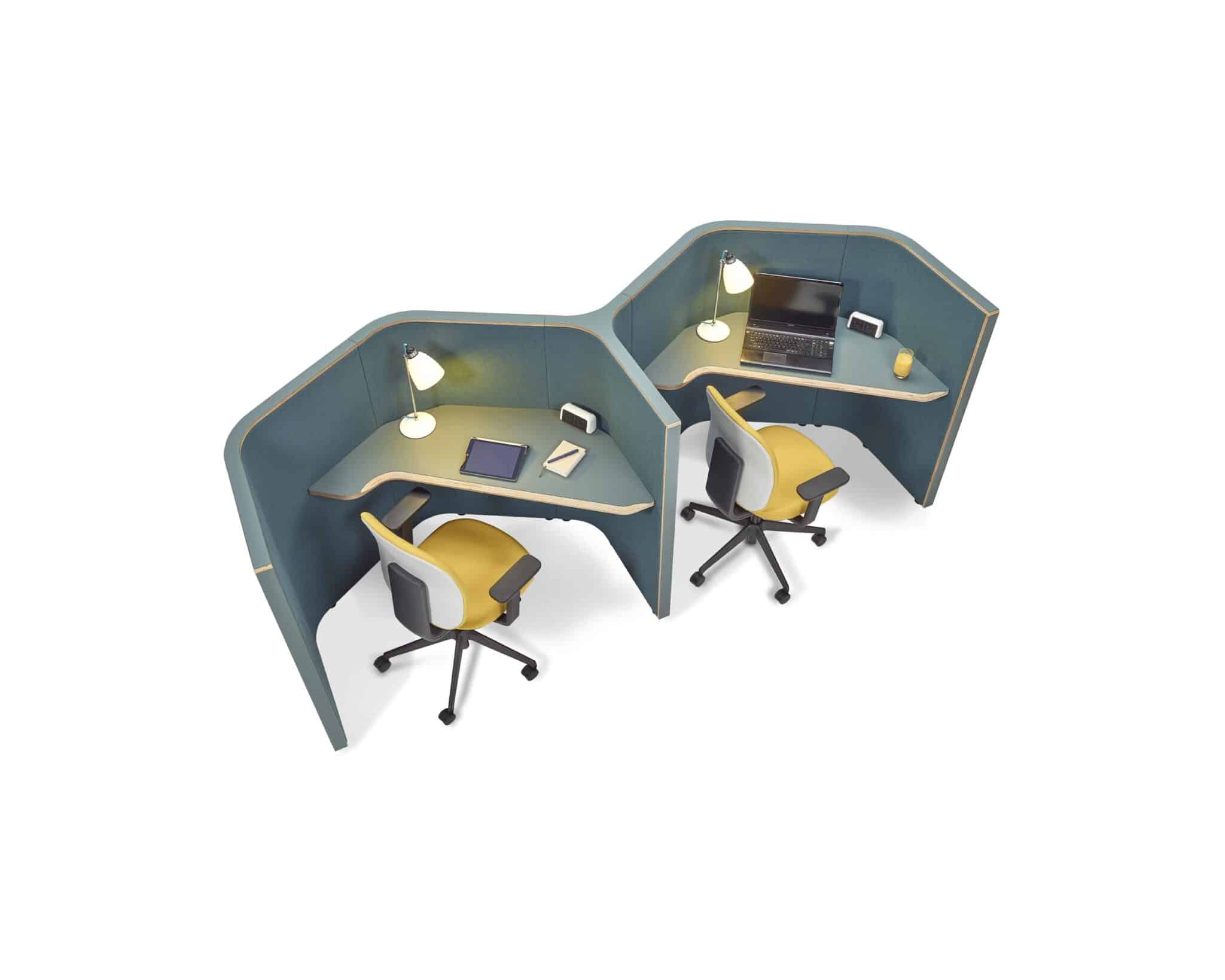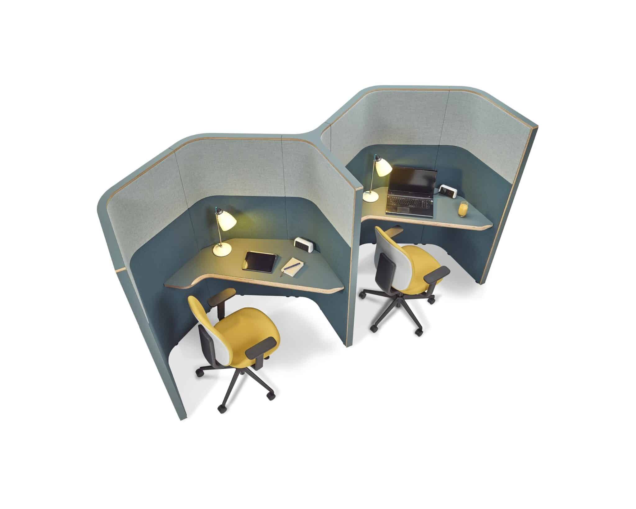 BILP 2 – a double unit, hexagonal, upholstered personal ‘in-line’ pods, with an MFC finish, ergonomically-shaped worktop and with top and end caps in polished plywood with a nano-tech laminate surface finish – with a medium panel height or with a high panel height