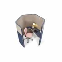 BCP 1 – a single, hexagonal, upholstered personal ‘cluster’ pod, with an MFC finish, ergonomically-shaped worktop and with top and end caps in polished plywood with a nano-tech laminate surface finish – with a medium panel height or with a high panel height