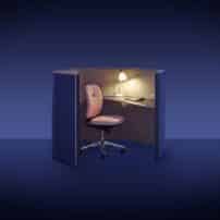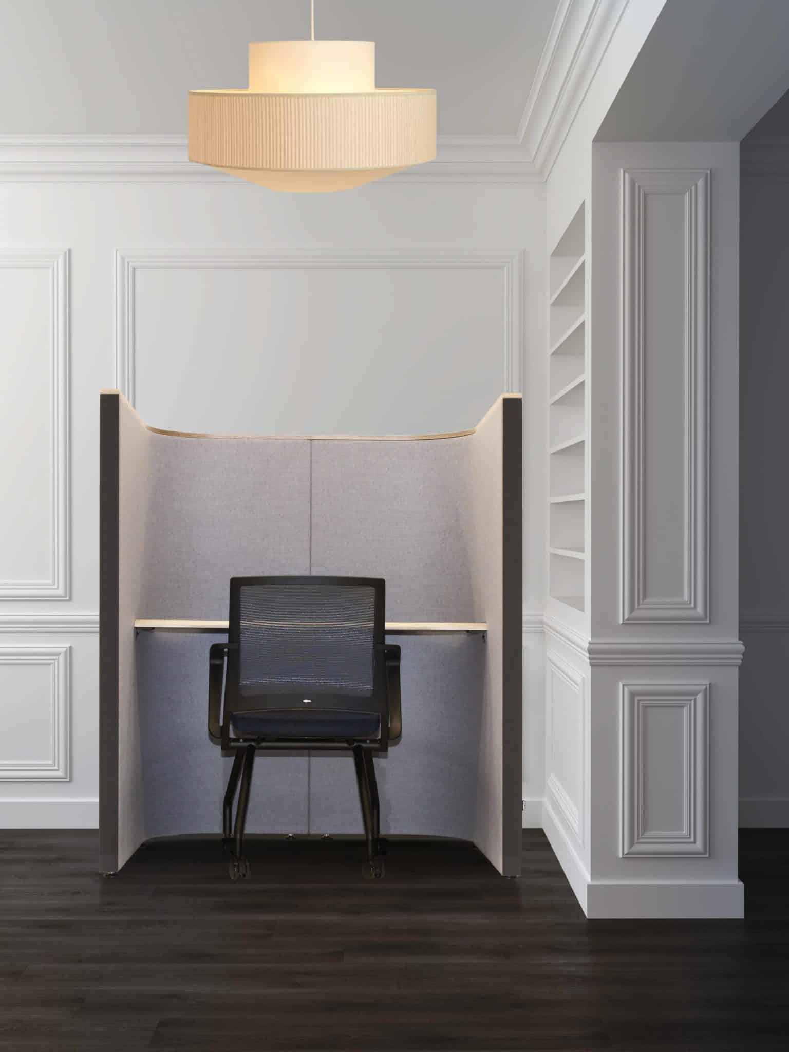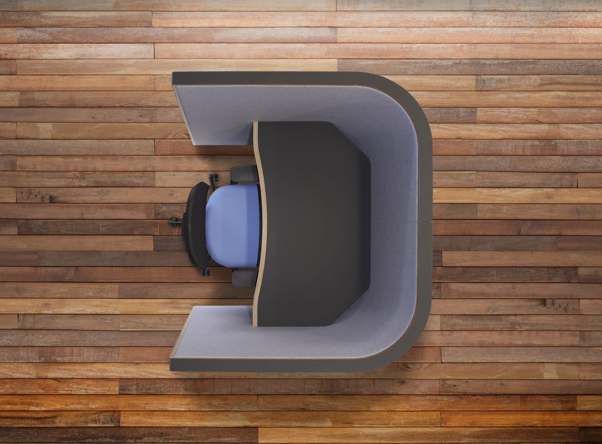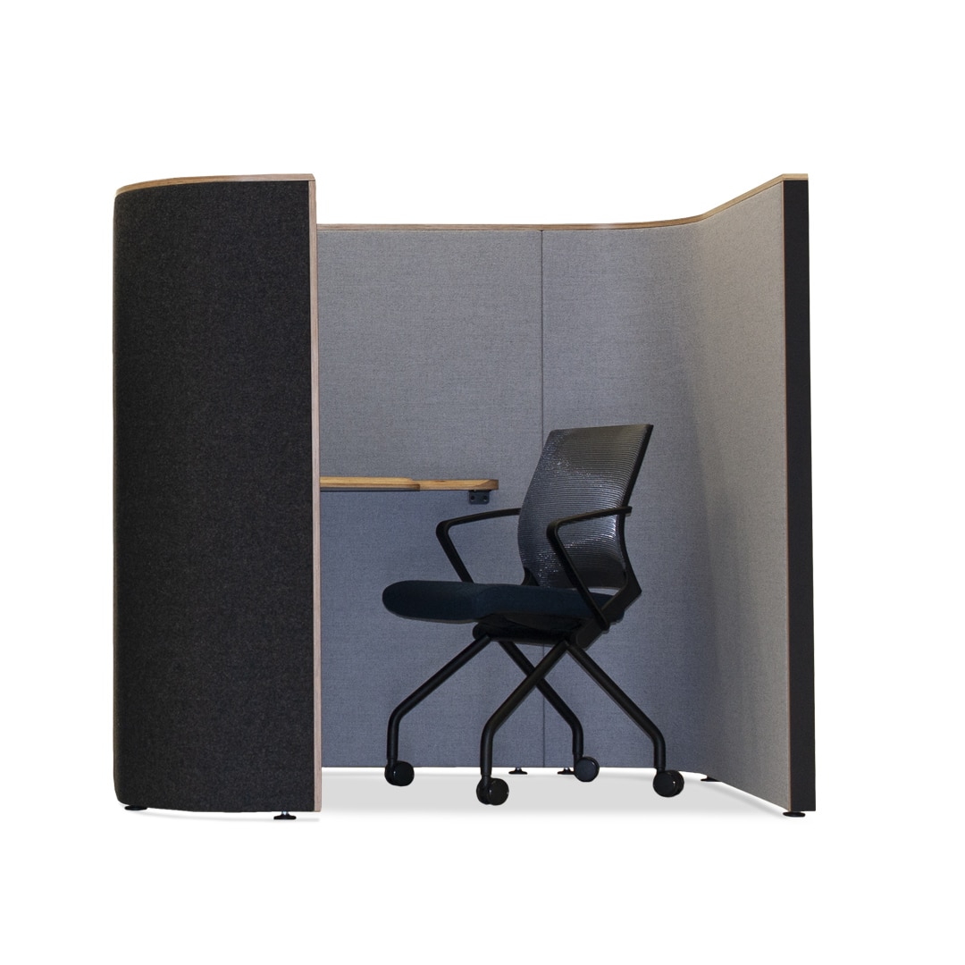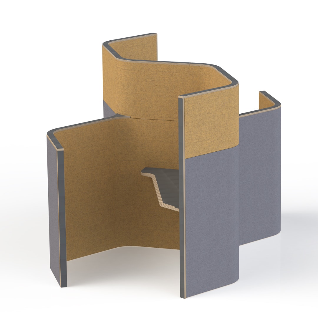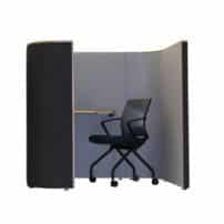 solo work booth, with acoustic surround, with an upholstered seating bench and an MFC worktop