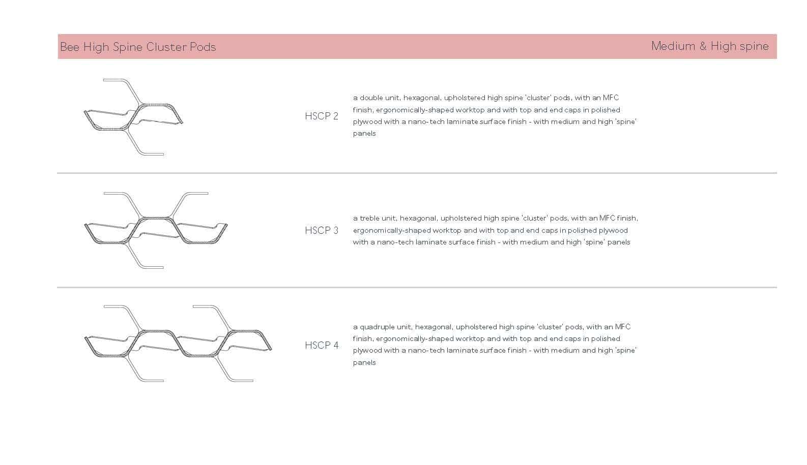 HSCP 2 – a double unit, hexagonal, upholstered high spine ‘cluster’ pods, with an MFC finish, ergonomically-shaped worktop and with top and end caps in polished plywood with a nano-tech laminate surface finish – with medium and high ‘spine’ panels