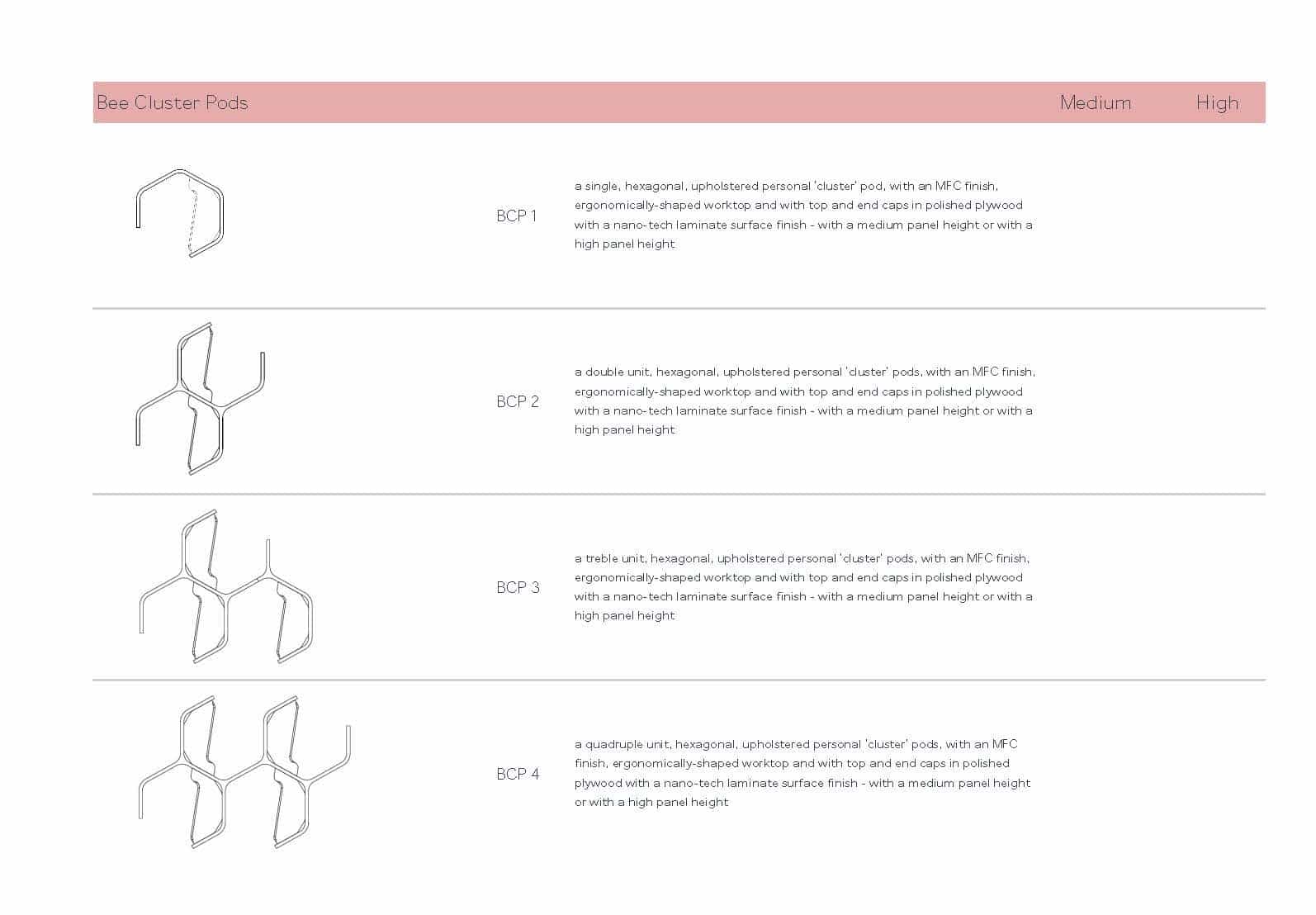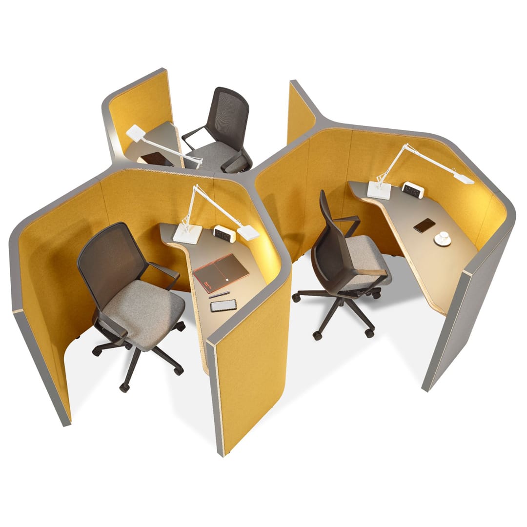 BCP 4 – a quadruple unit, hexagonal, upholstered personal ‘cluster’ pods, with an MFC finish, ergonomically-shaped worktop and with top and end caps in polished plywood with a nano-tech laminate surface finish – with a medium panel height or with a high panel height