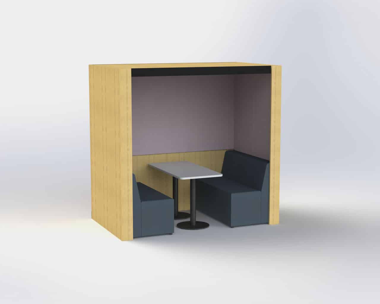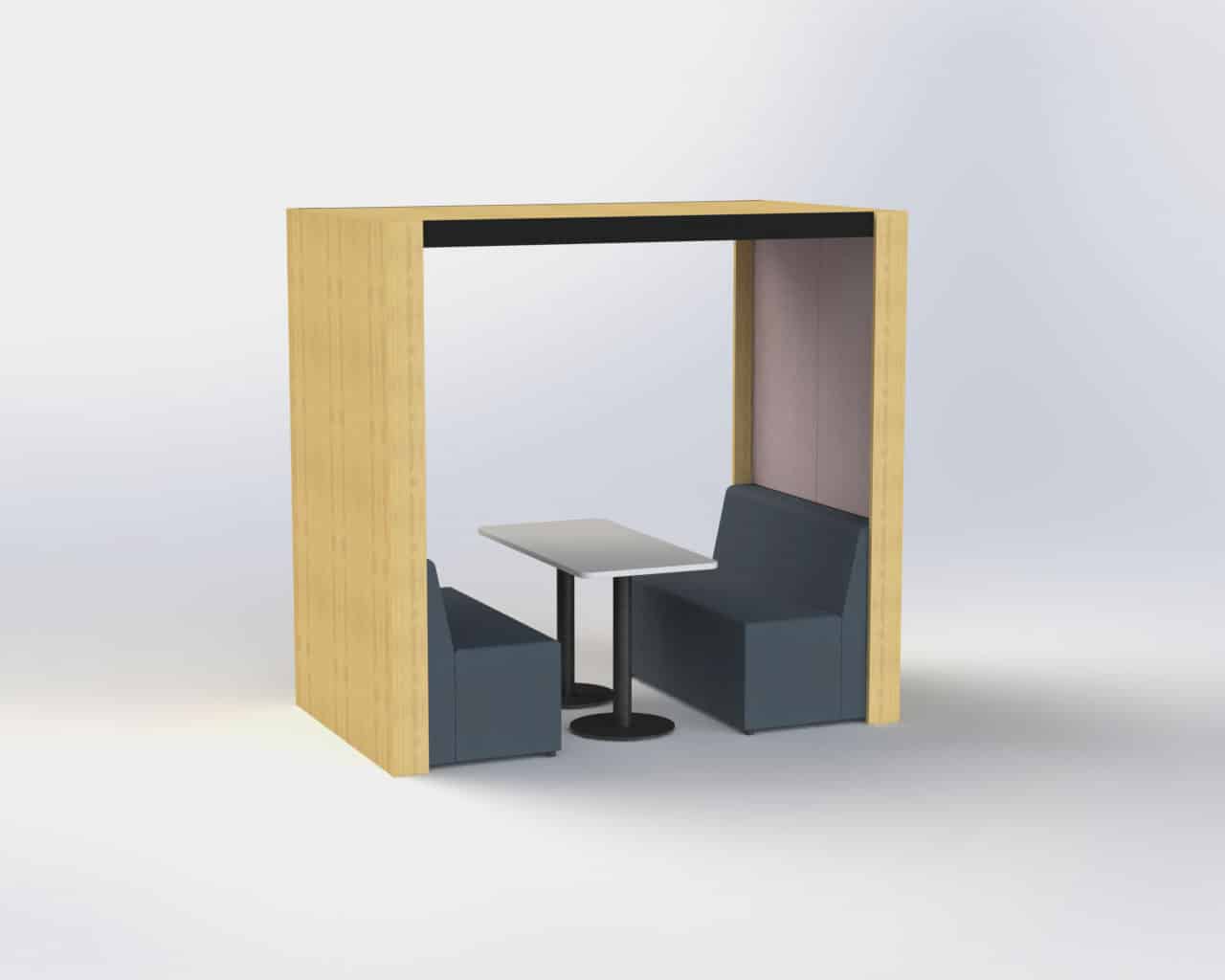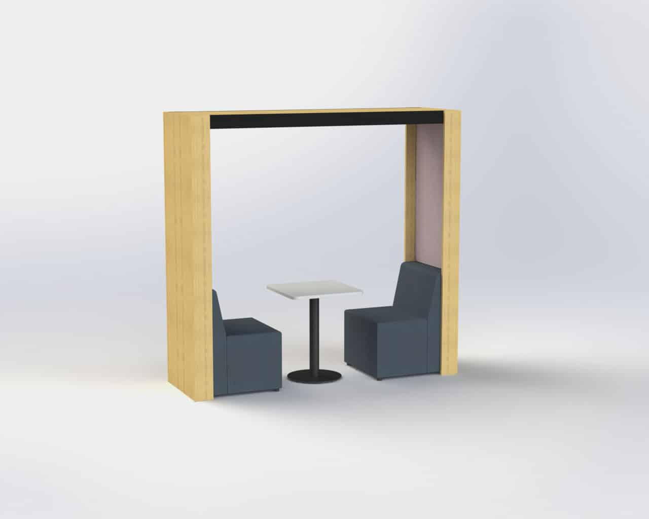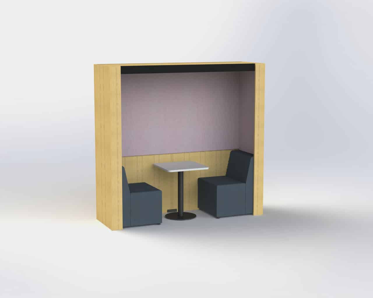 two person, MFC clad seating booth, with table, LED lighting and a half-upholstered back wall, MFC outer panels