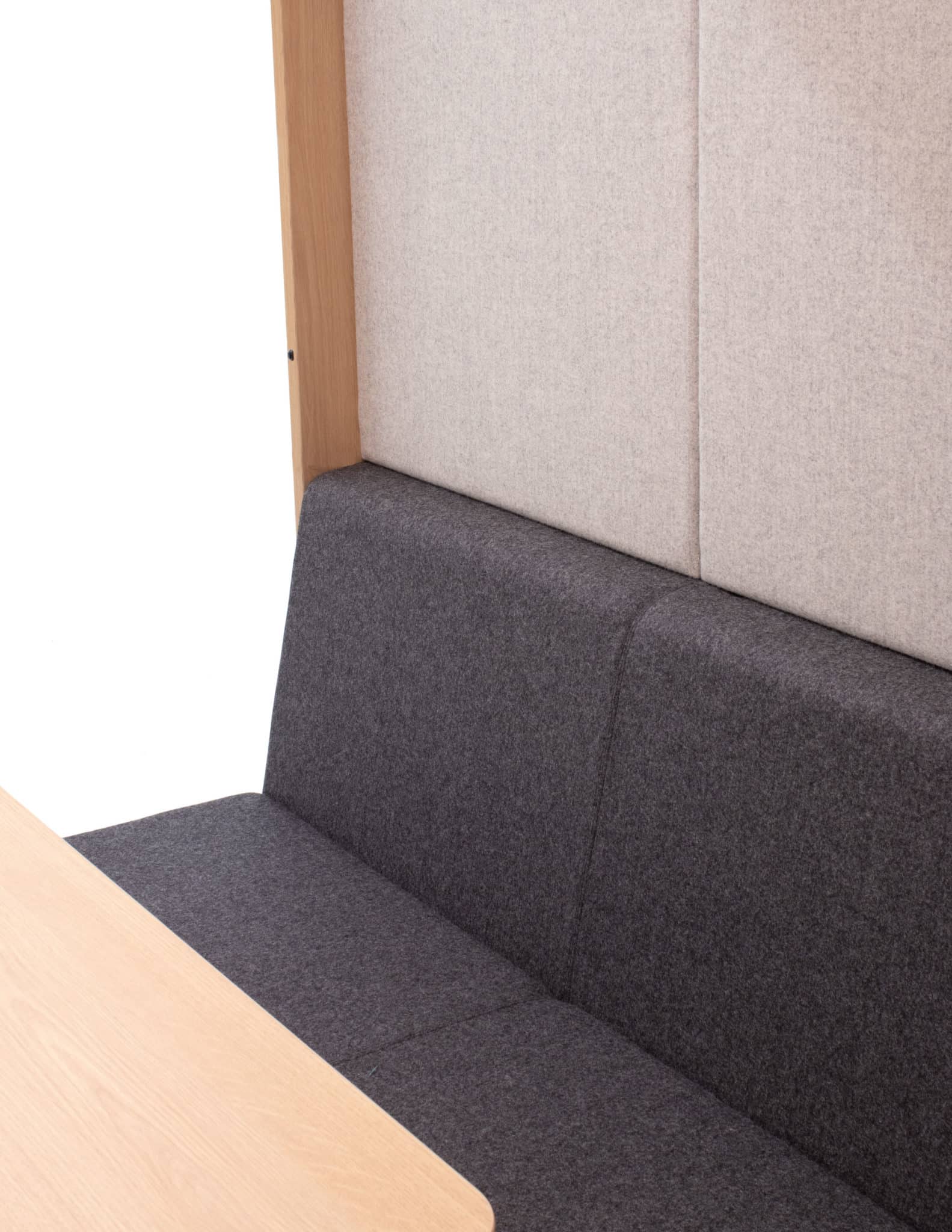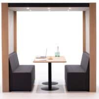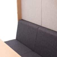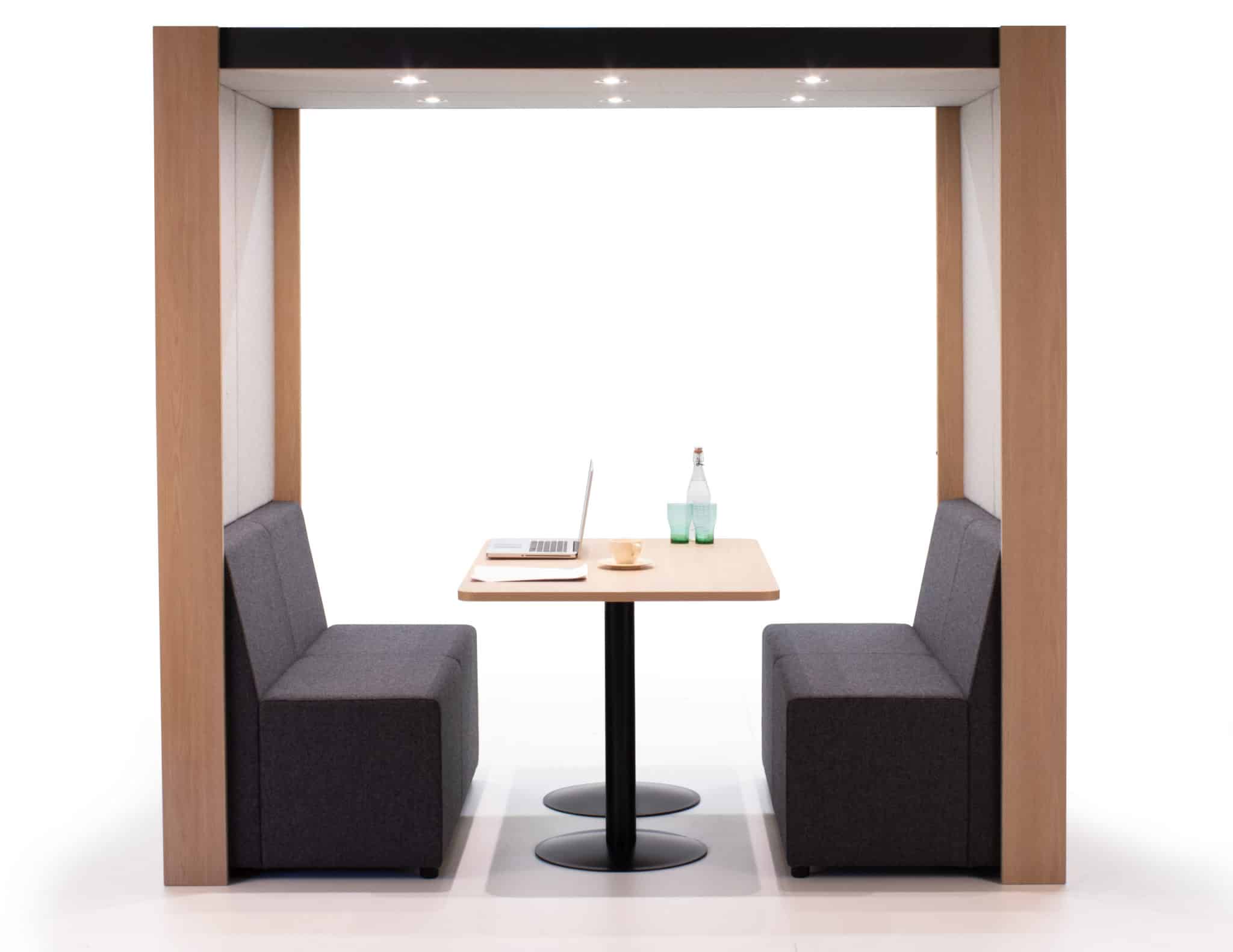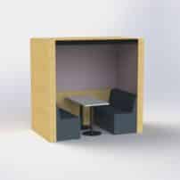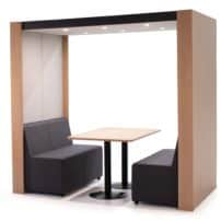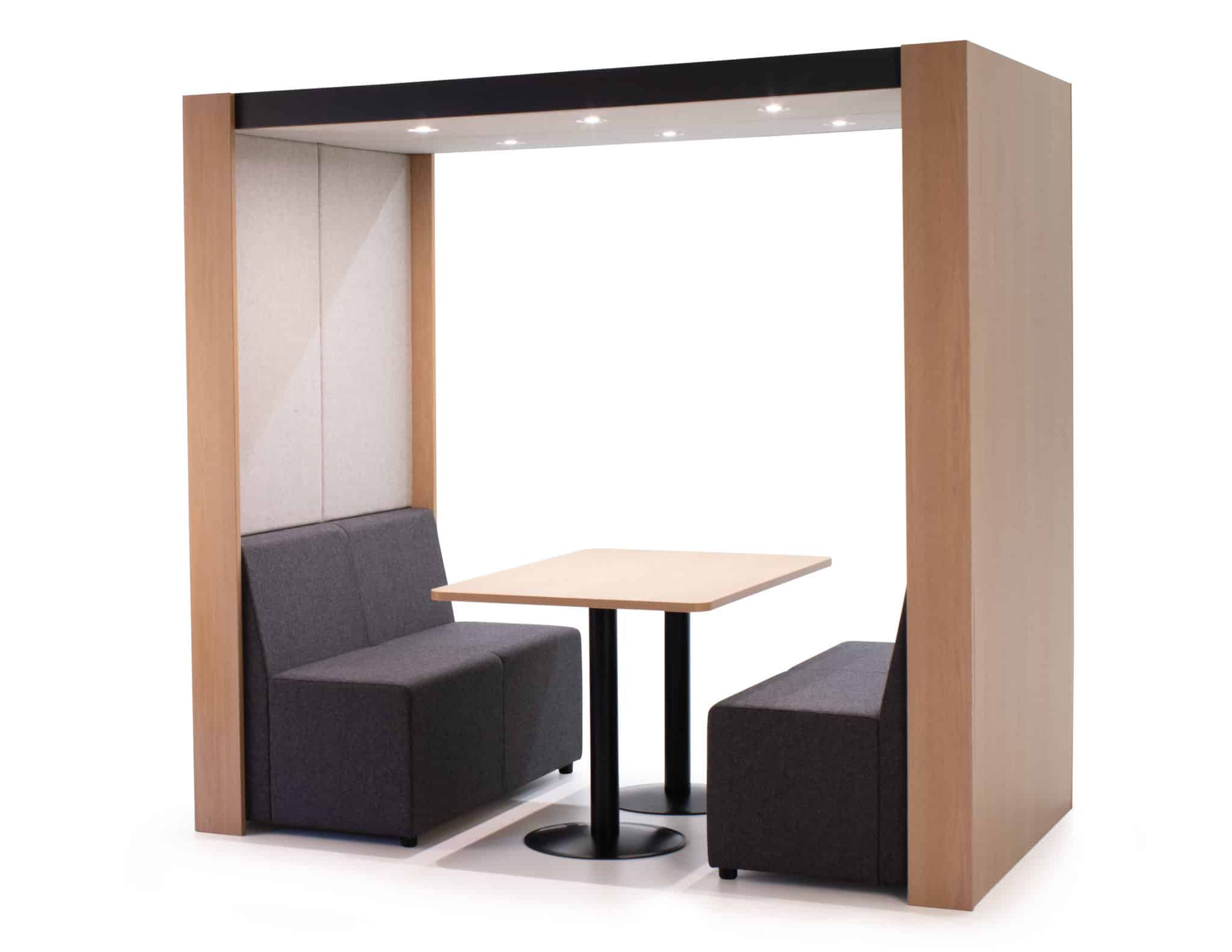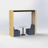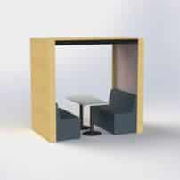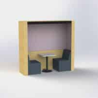 two person, MFC clad seating booth, with table, LED lighting and a half-upholstered back wall, MFC outer panels