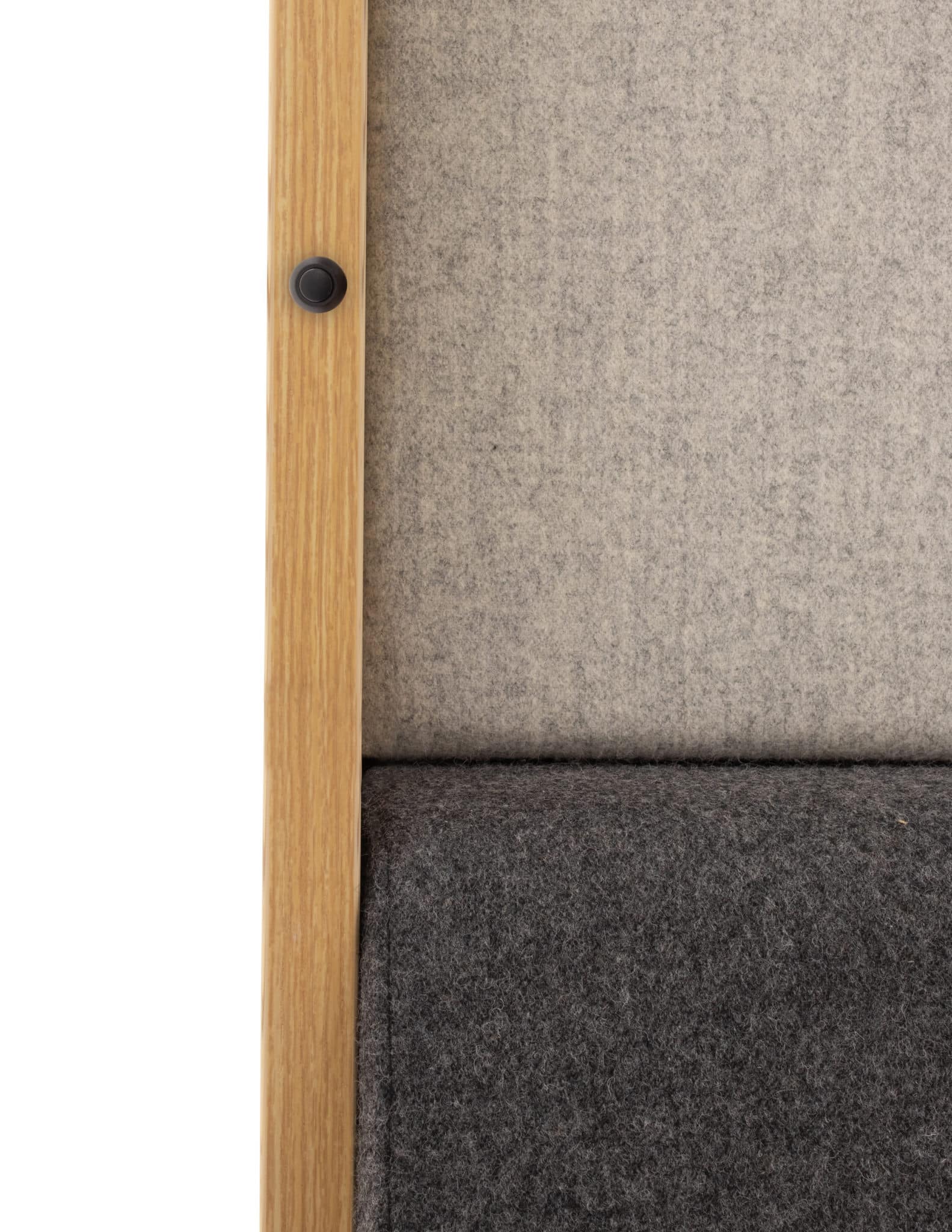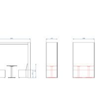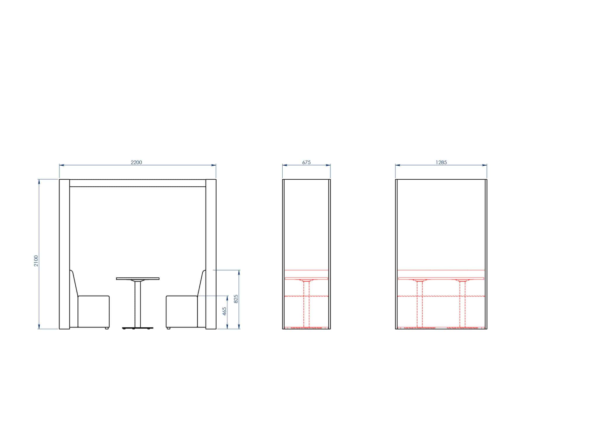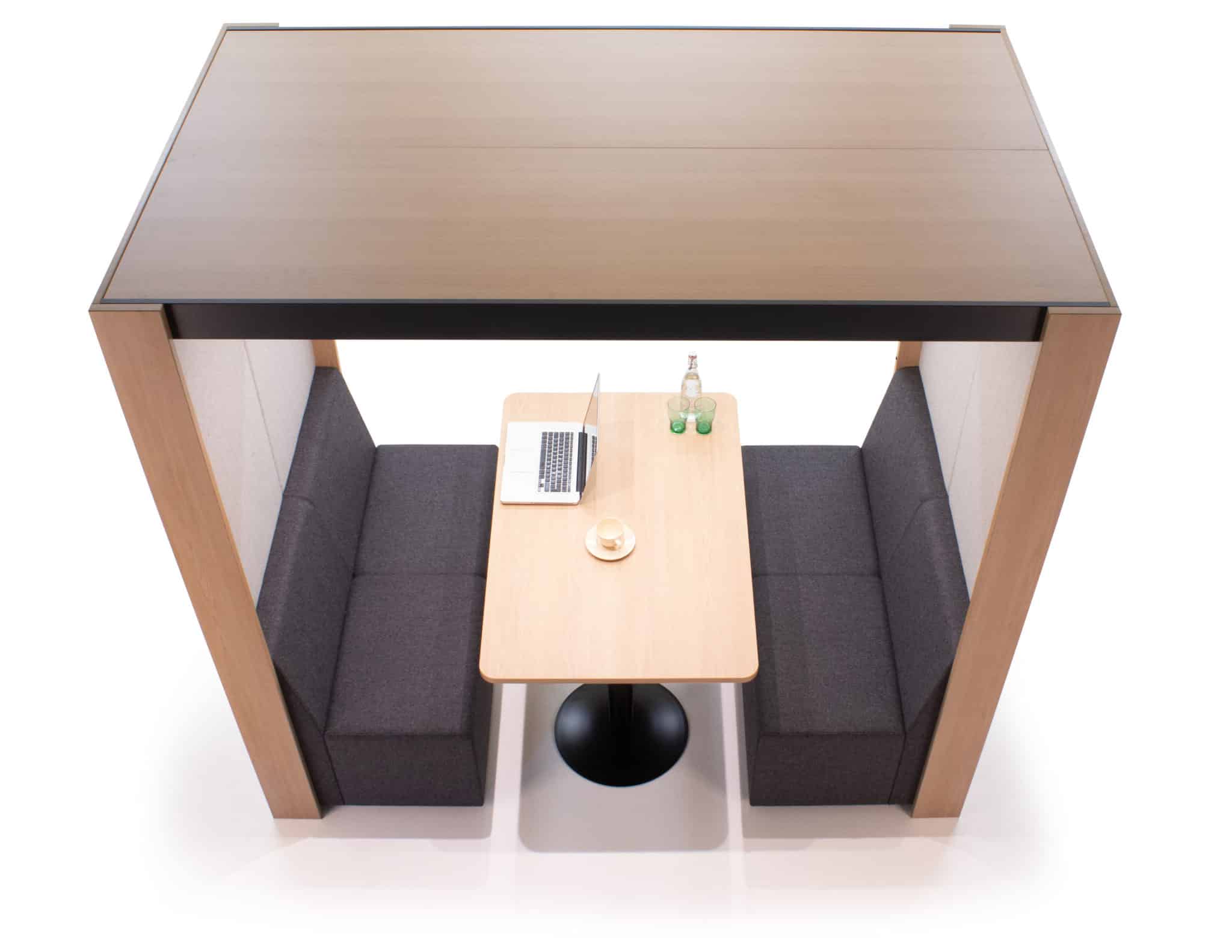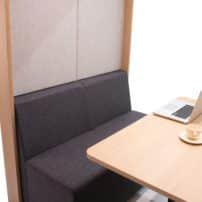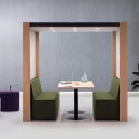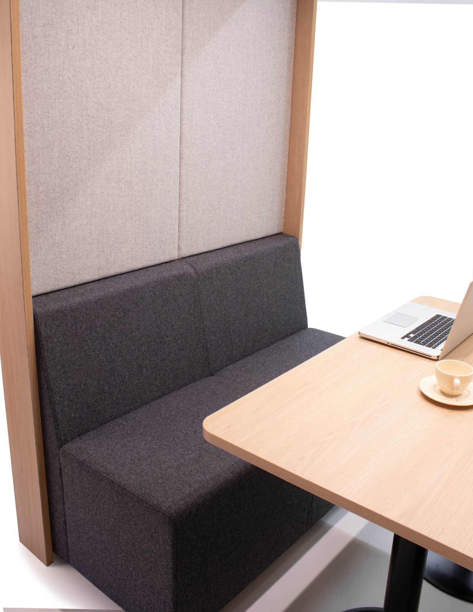 two person, MFC clad seating booth, with table, LED lighting and a half-upholstered back wall, MFC outer panels