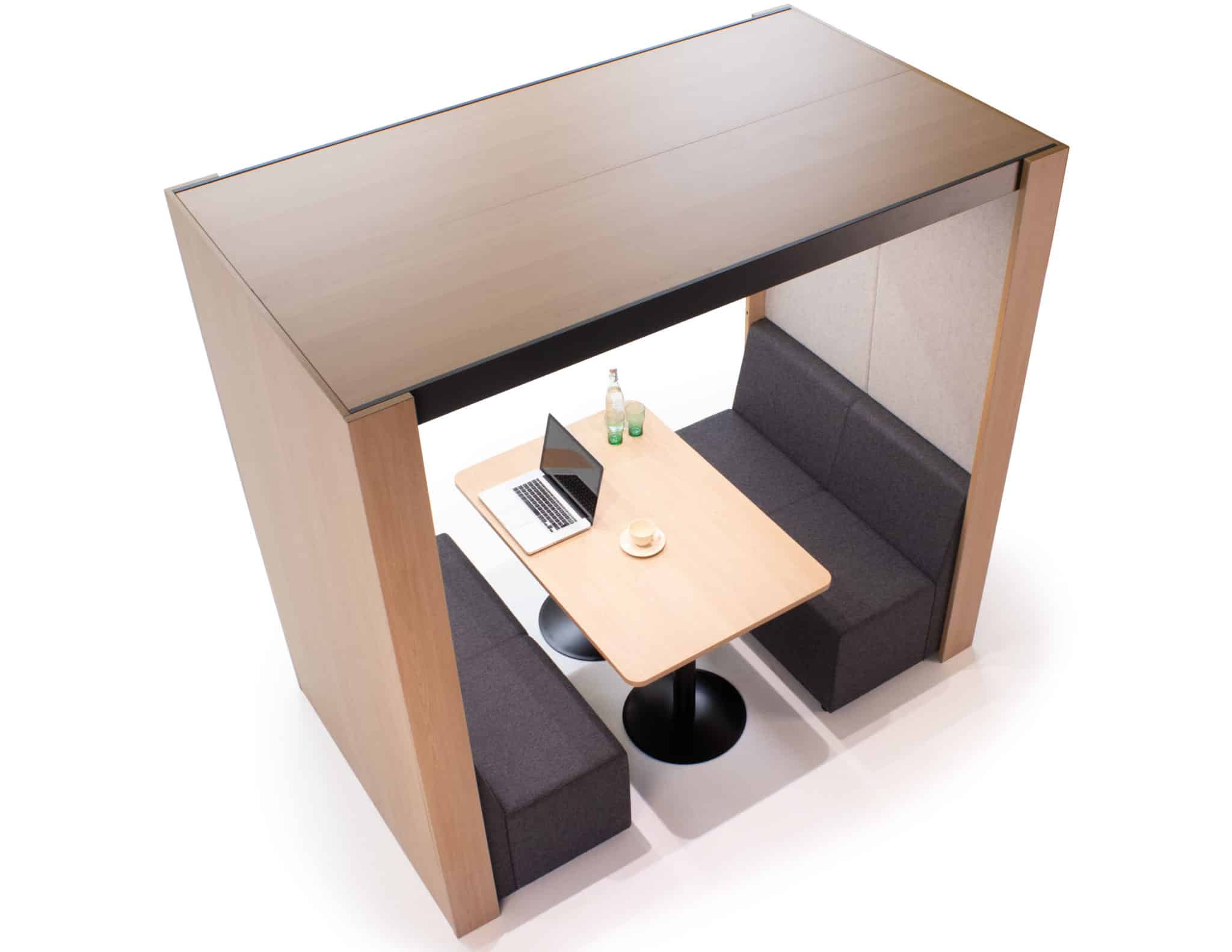 four person, MFC clad seating booth, with table, LED lighting and a half-upholstered back wall, MFC outer panels