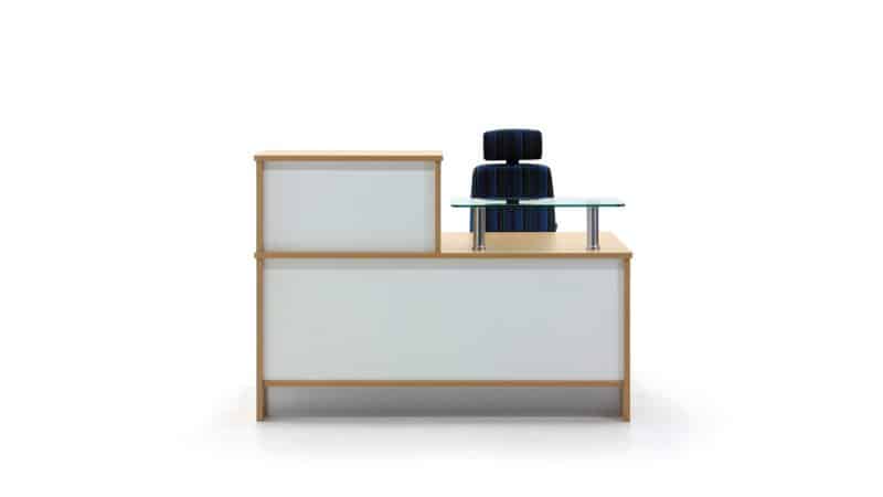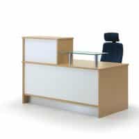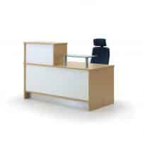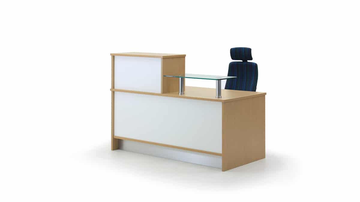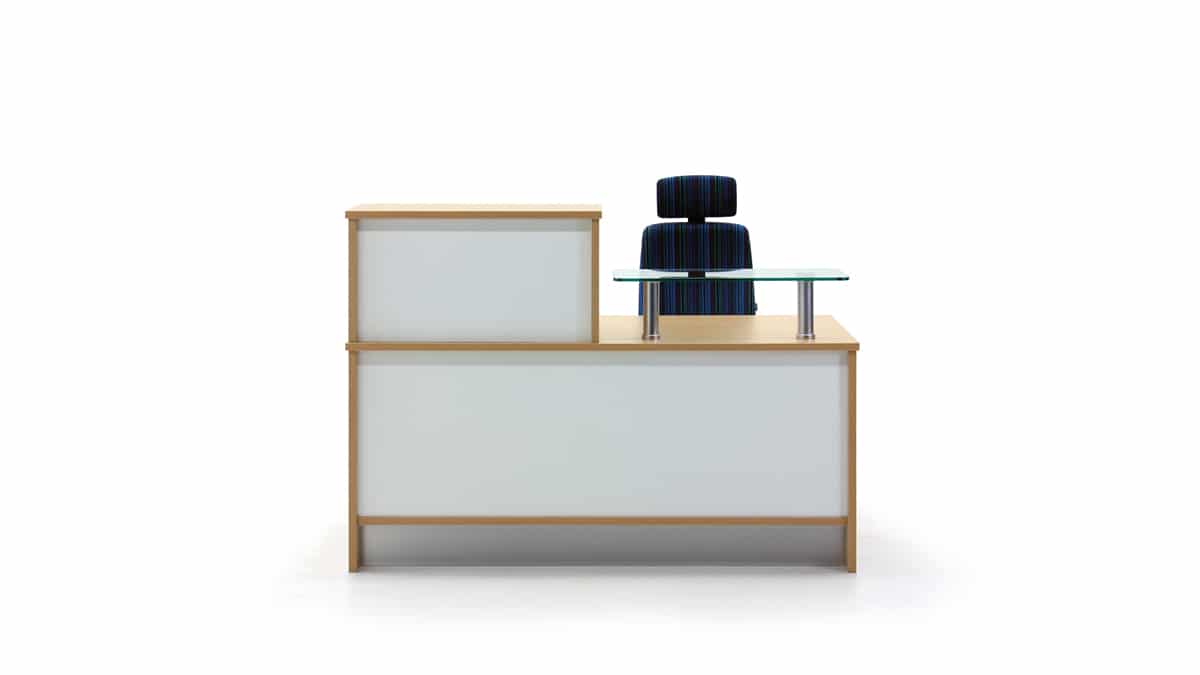 Rectangular reception desk, with a full depth modesty panel, cut back plinth and over-desk top box.