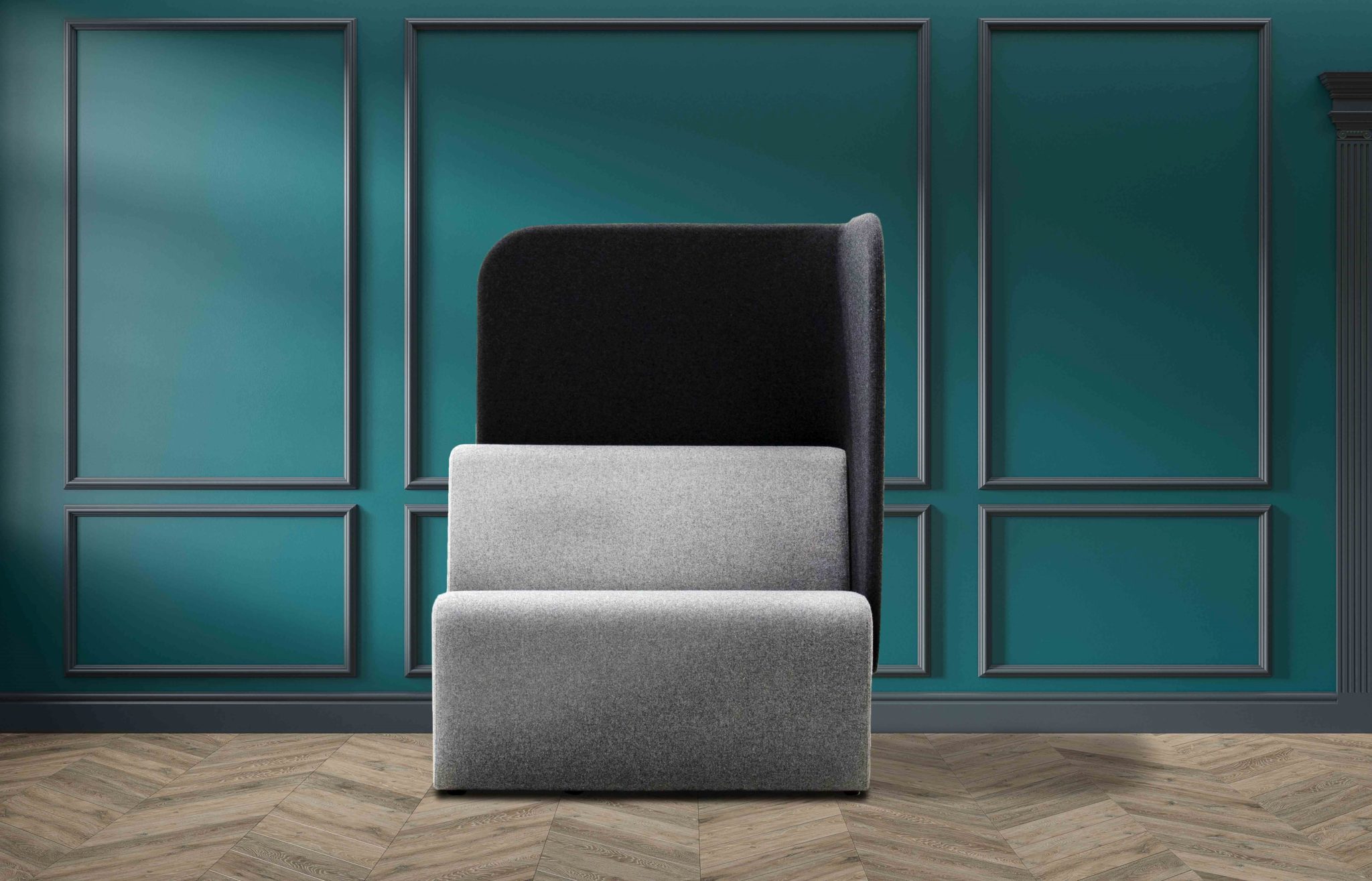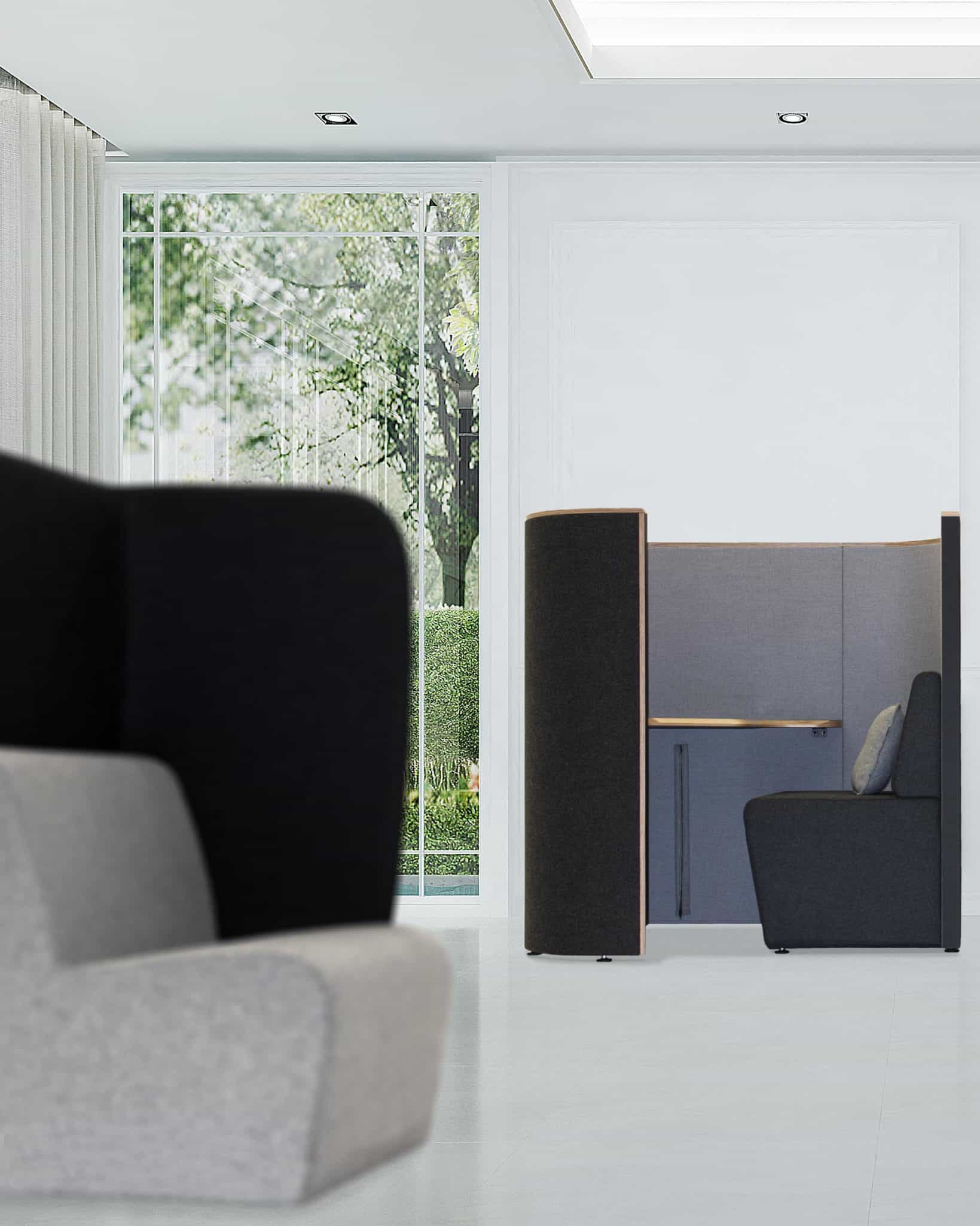 solo work booth, with acoustic surround on two sides, back and left hand facing