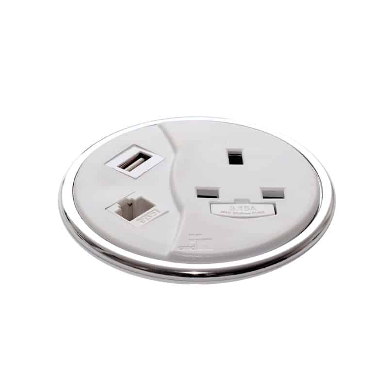 Through desk top charging and power module, with 1 x power socket and 2 x USB charging ports with 1m mains lead to a 3 pole connector