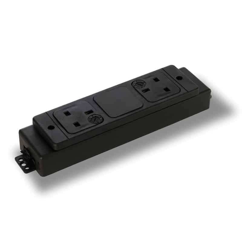 Under desk double power socket, individually fused to 3.15 Amps, with male 3 pole connector input and female 3 pole connector output, with earth lead to an M5 ring connector