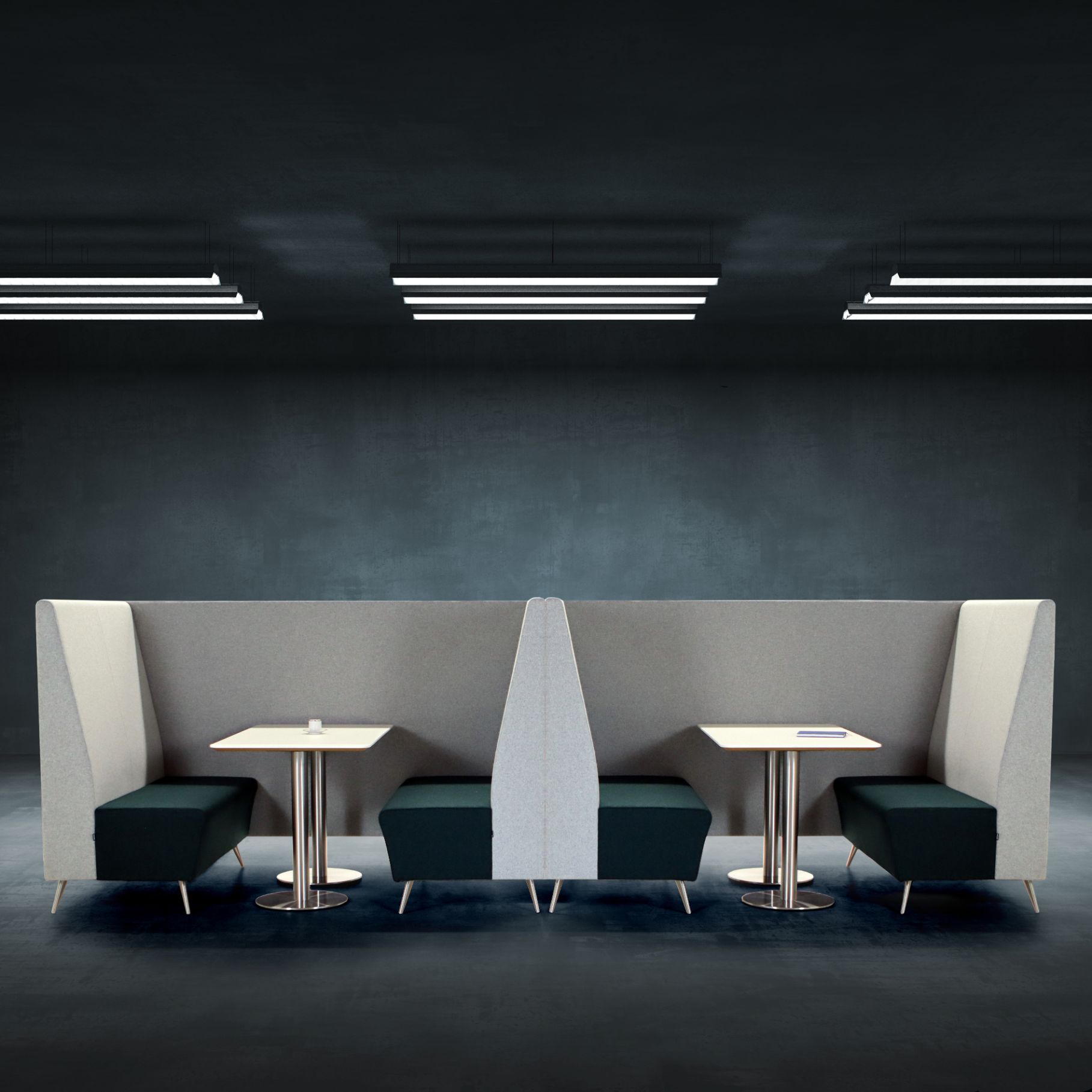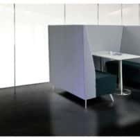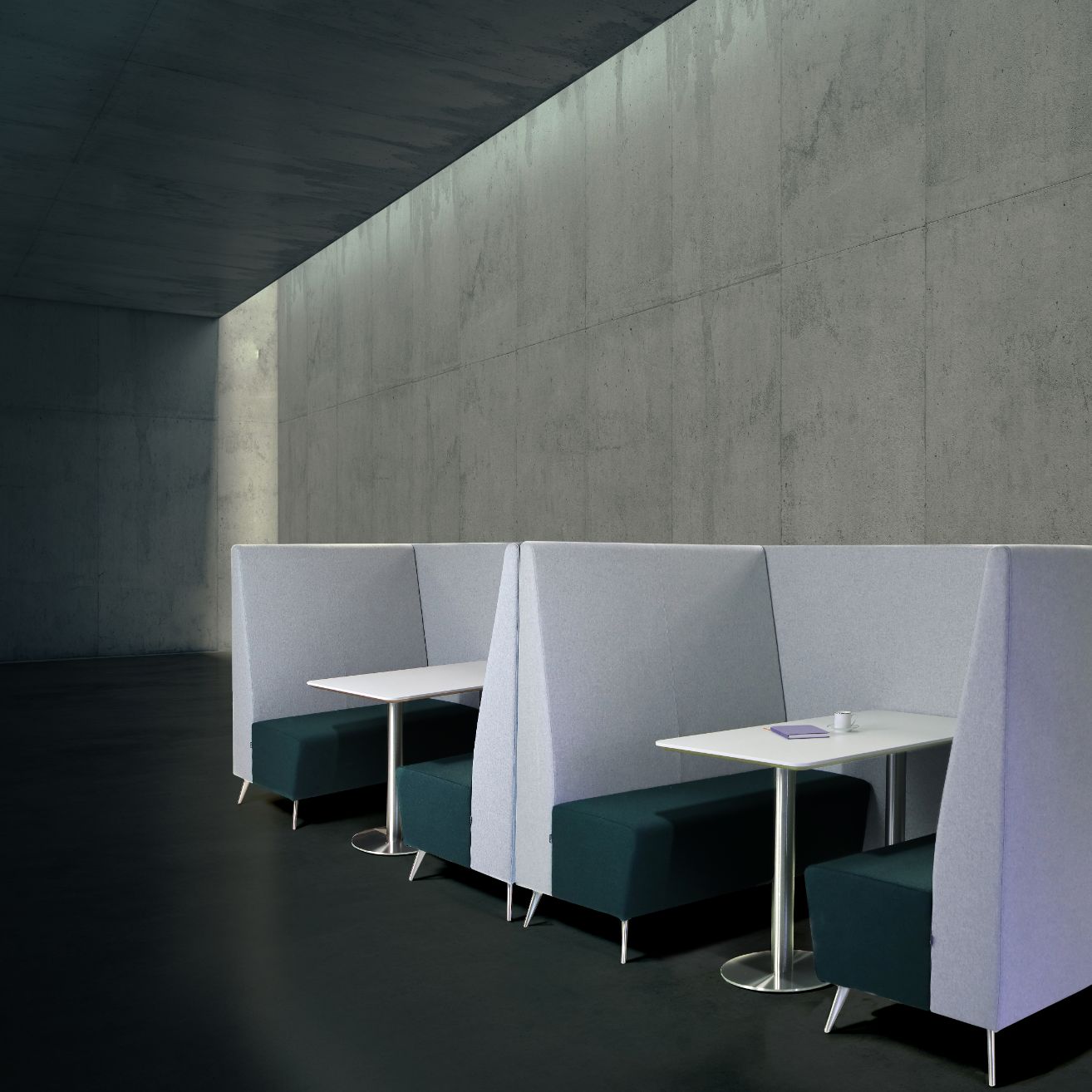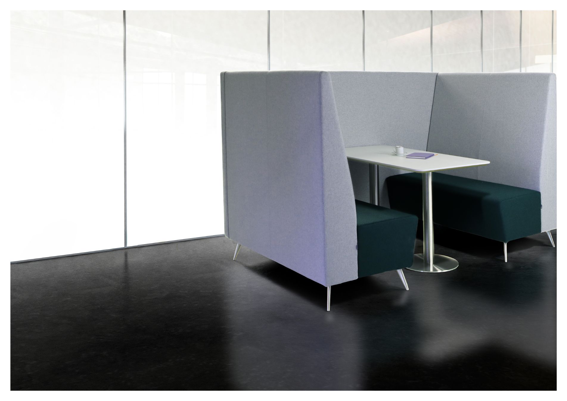 two person banquette seating unit with a link panel and an EDT 2, MFC finish table and a stainless steel column leg