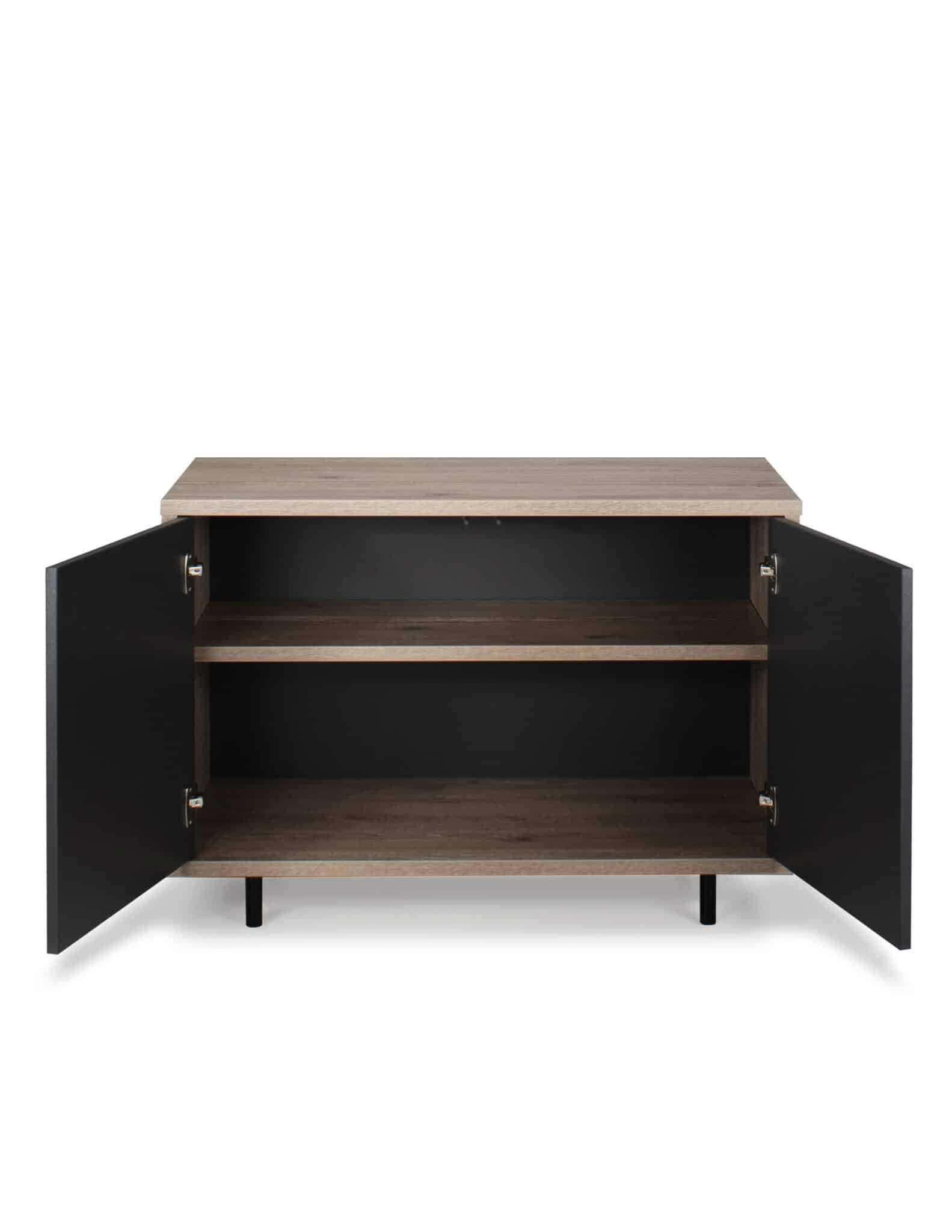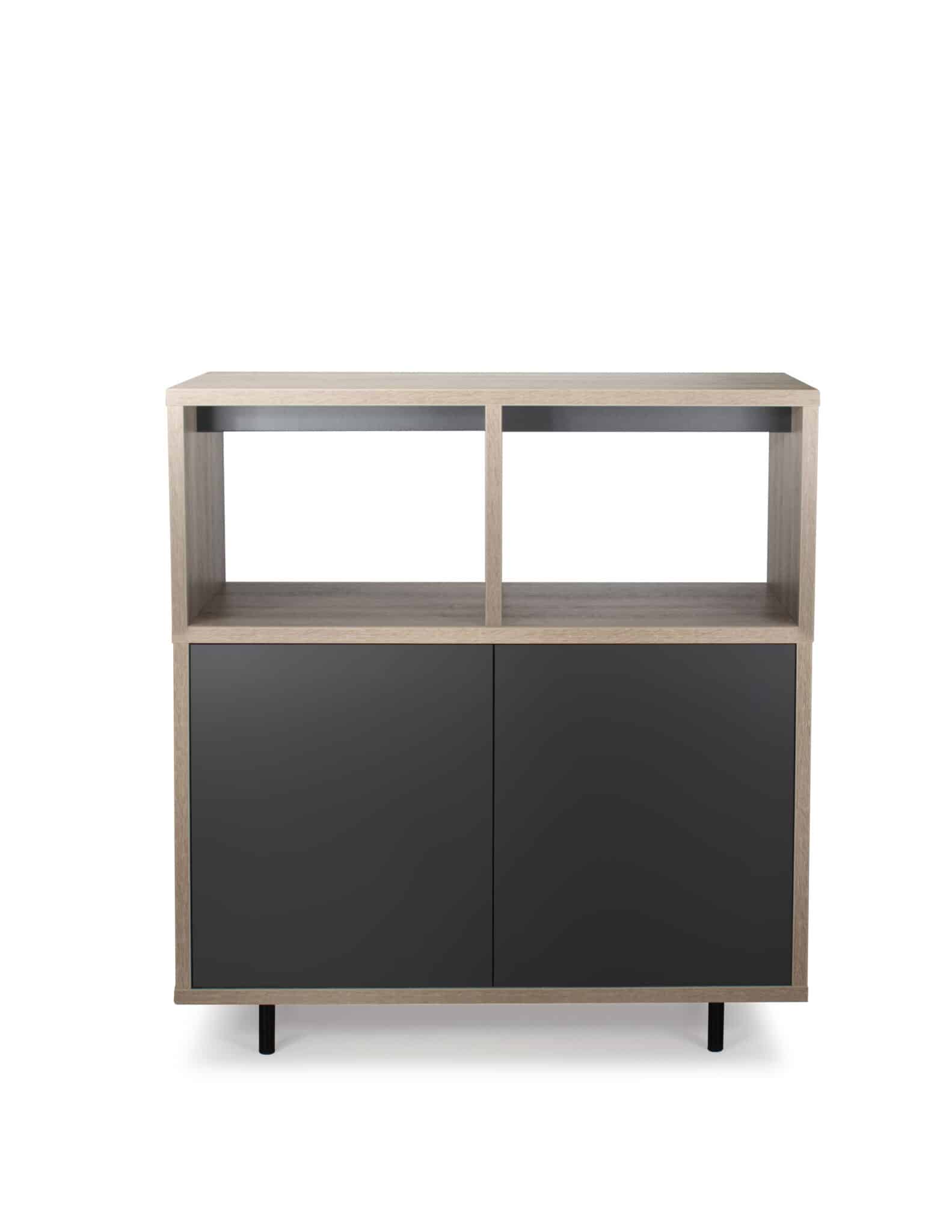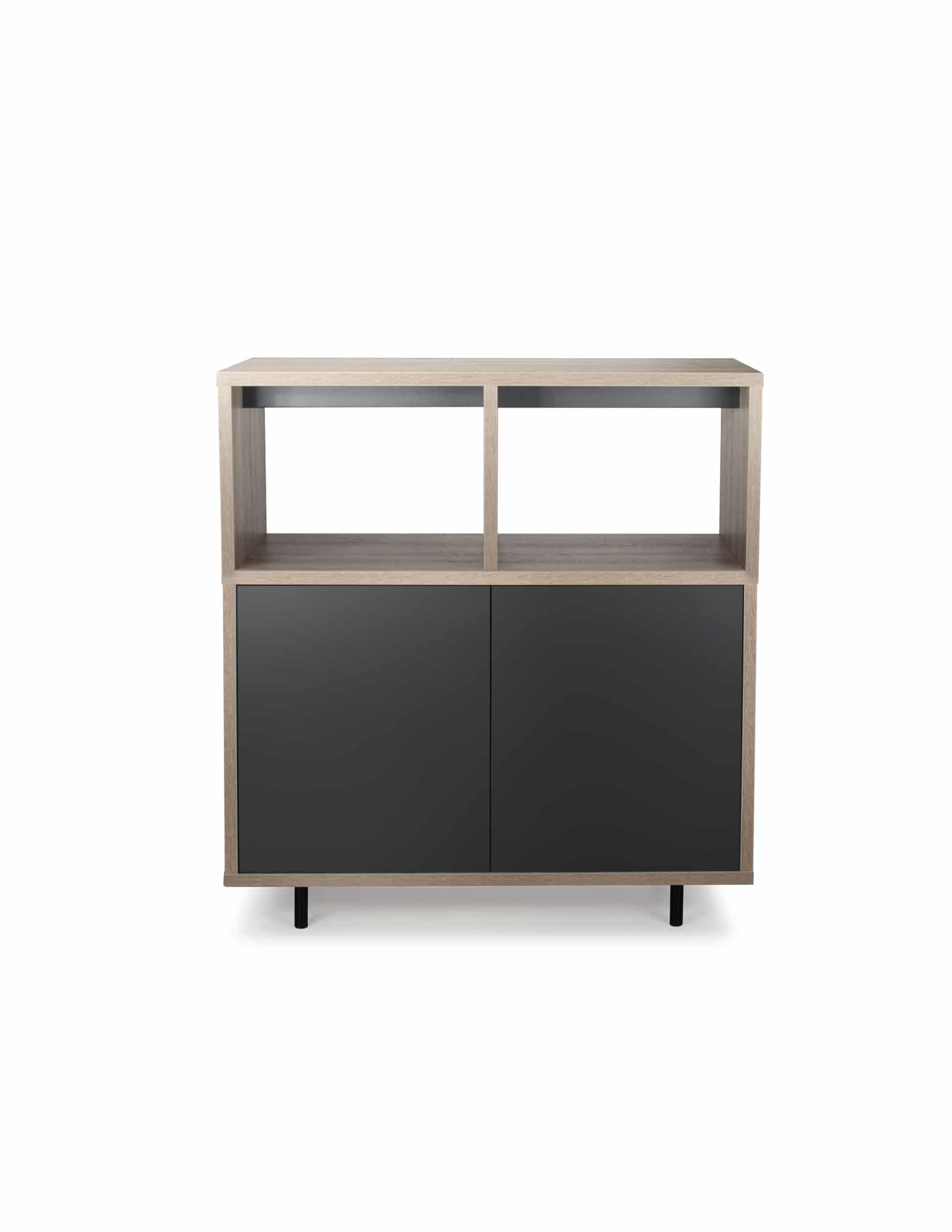 dividing low storage unit with two doors and with two open shelving sections, an MFC carcass, back panel to match the doors and black legs