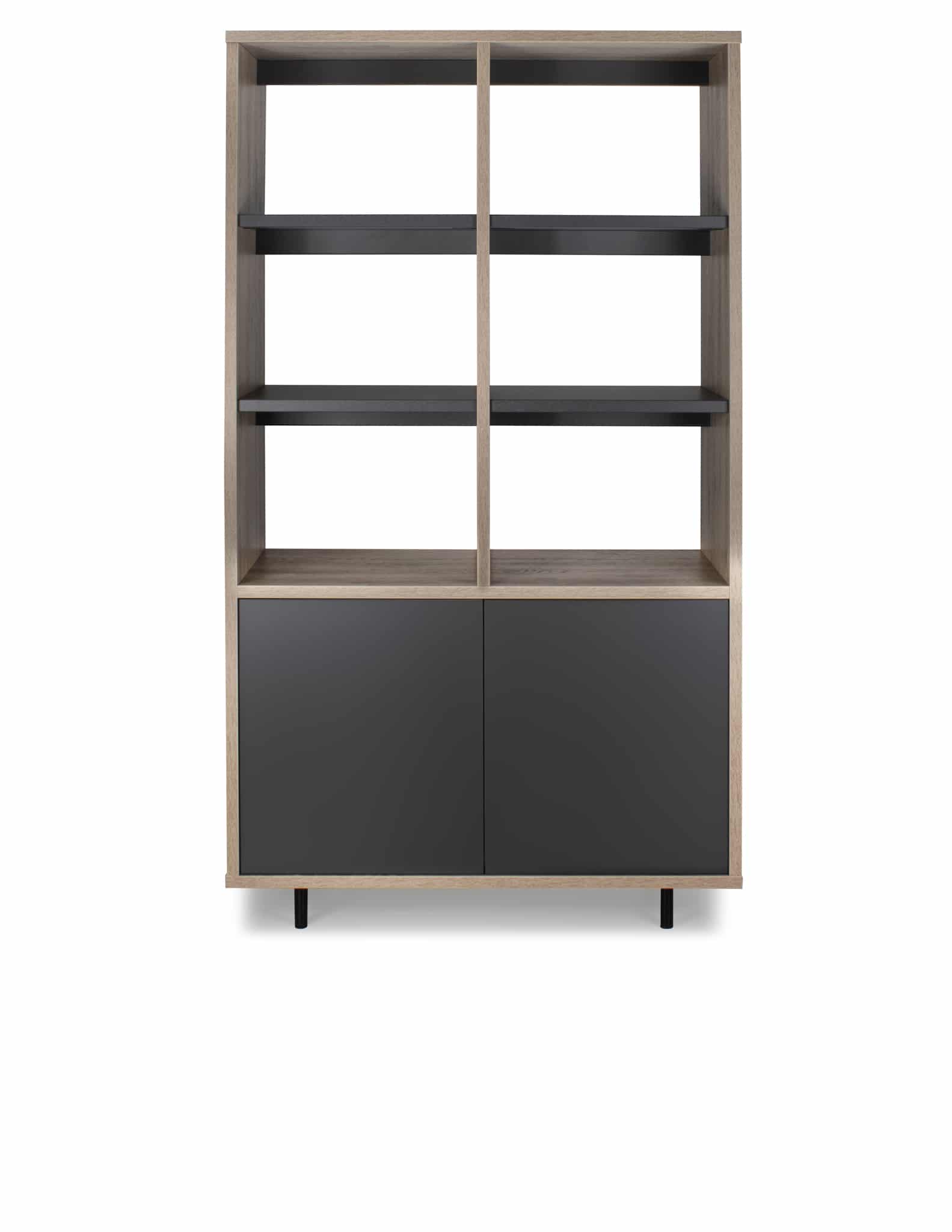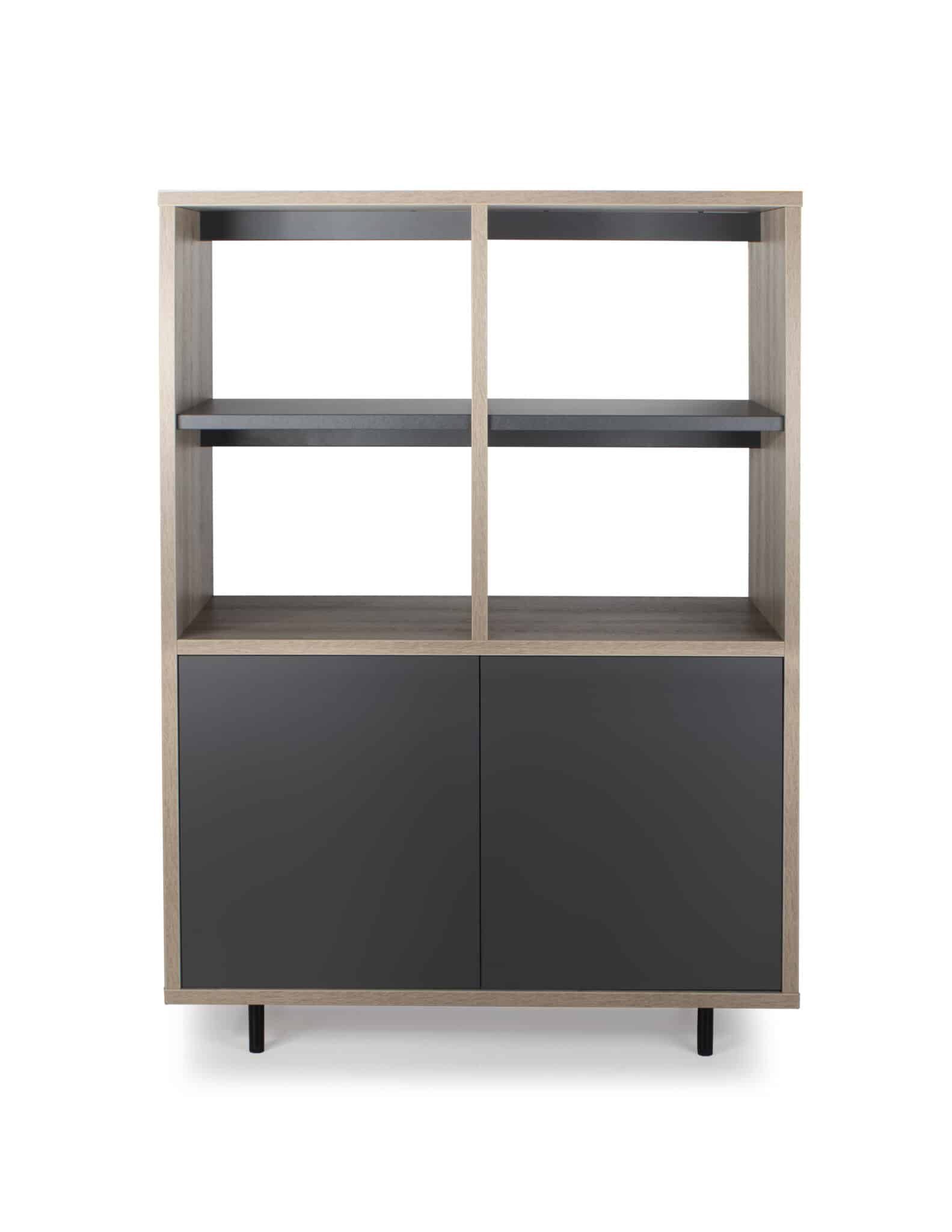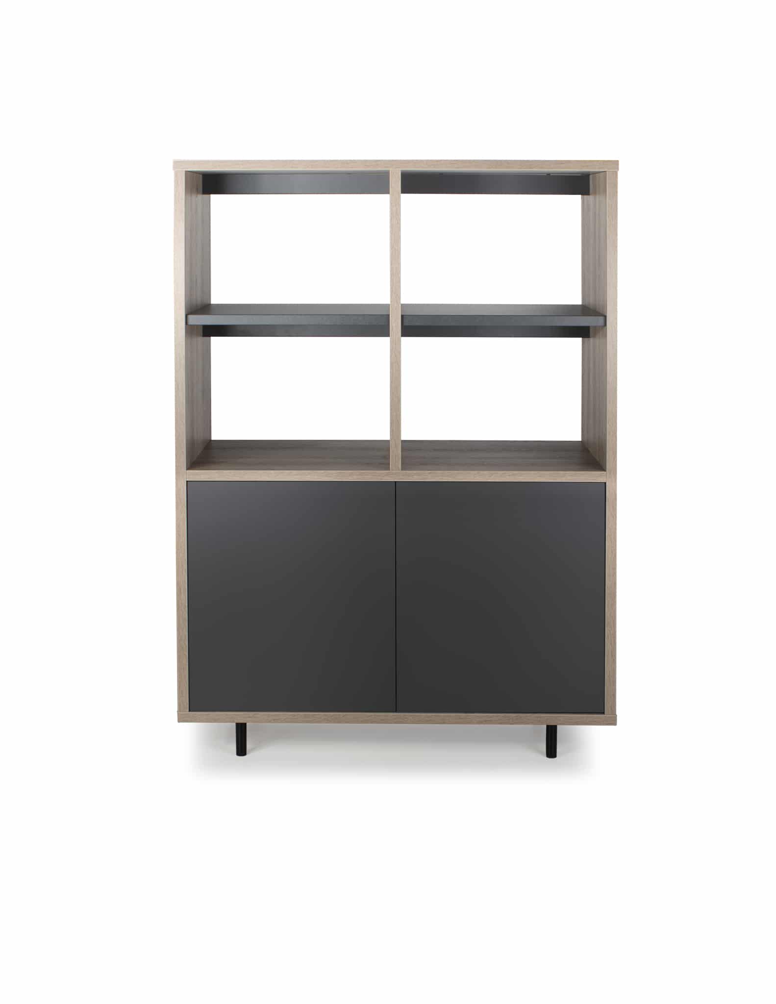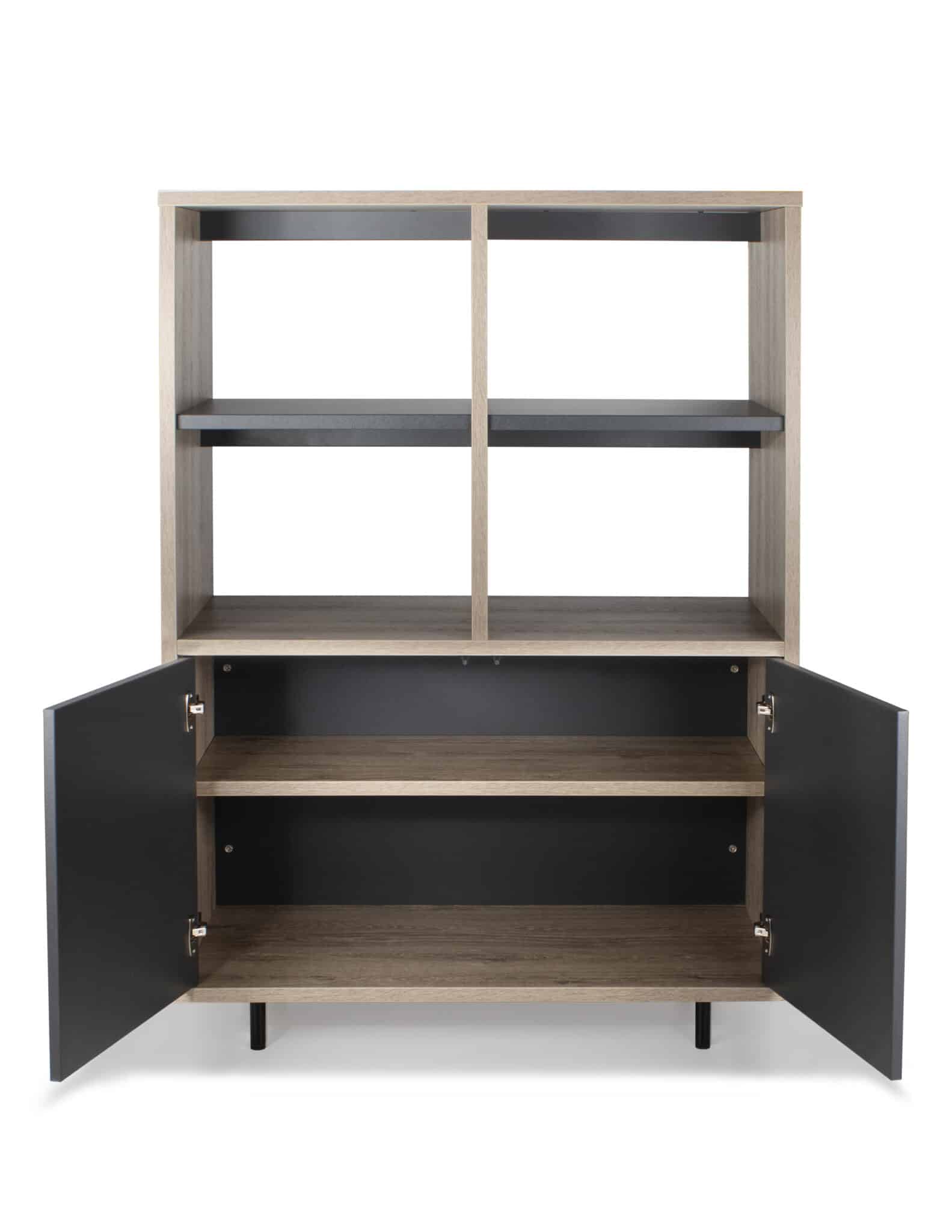 dividing low storage unit with two doors and with four open shelving sections, an MFC carcass, back panel to match the doors and black legs