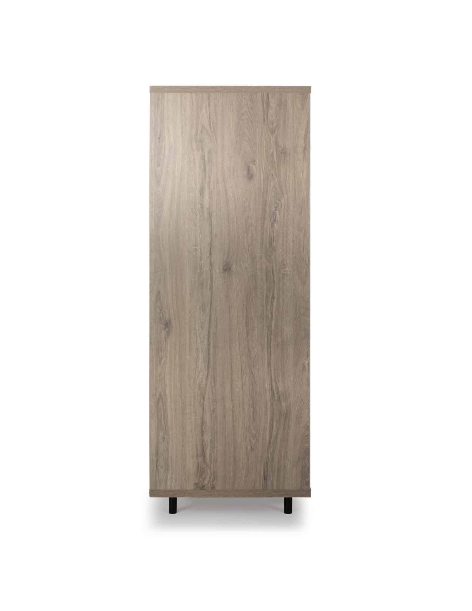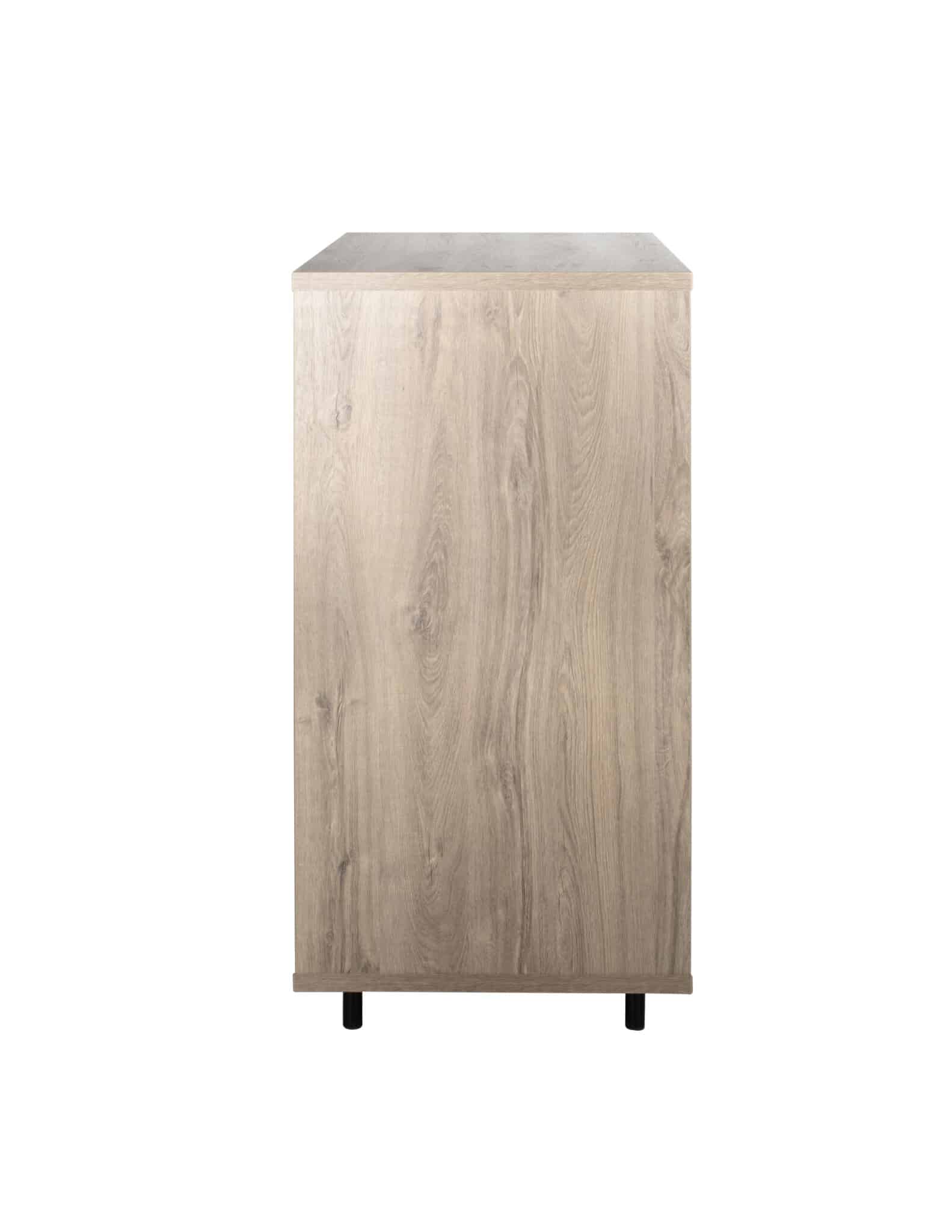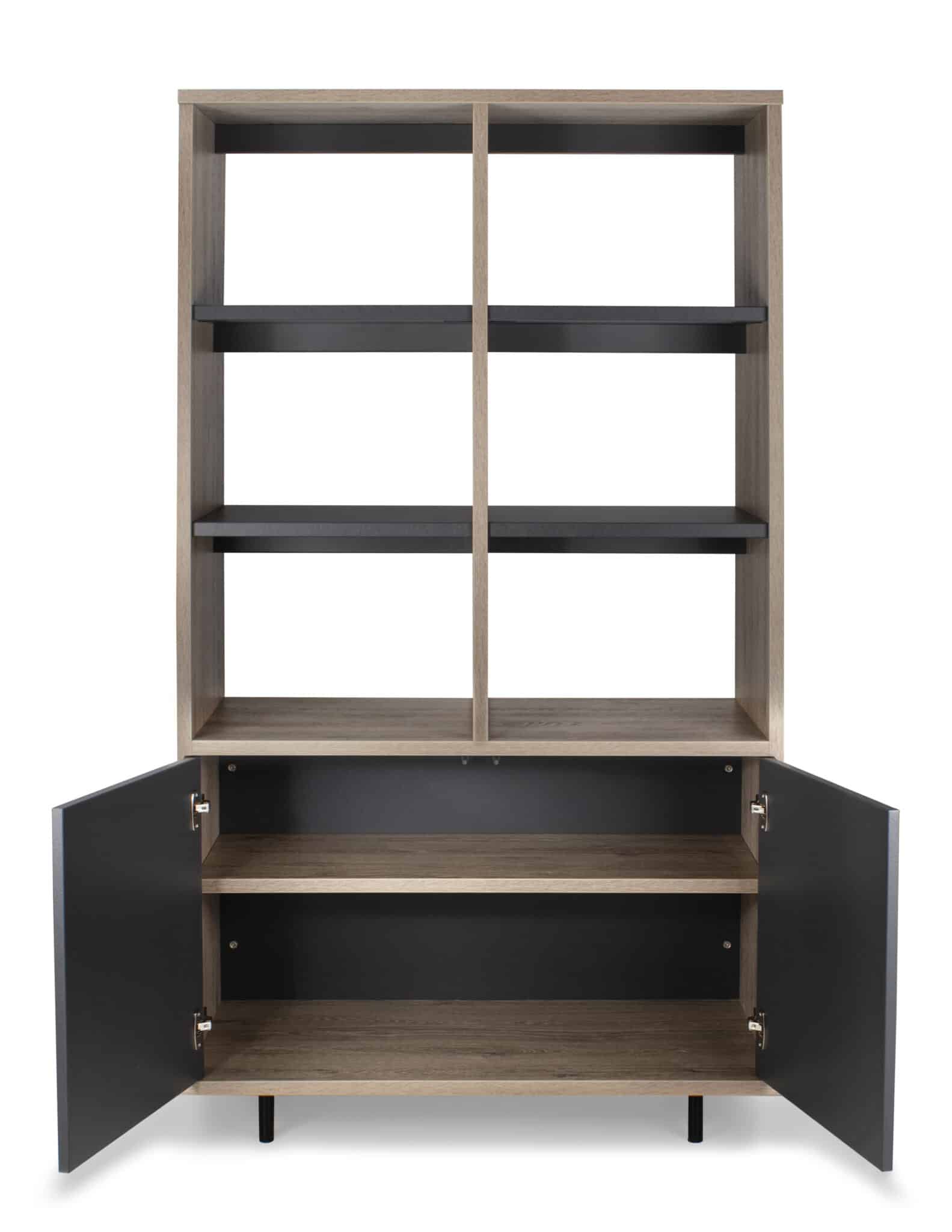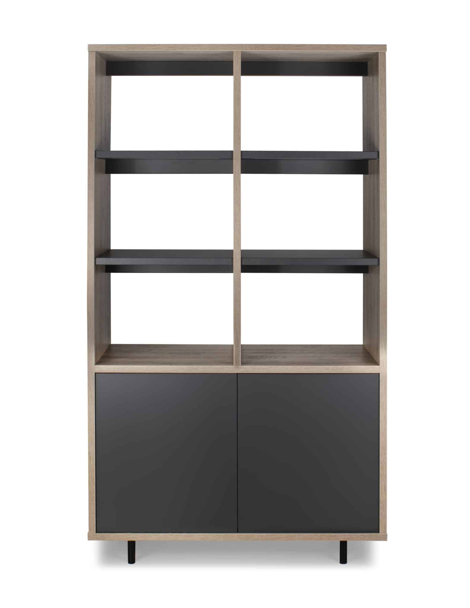 dividing low storage unit with two doors and with four open shelving sections, an MFC carcass, back panel to match the doors and black legs