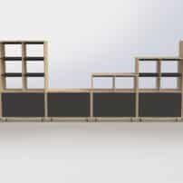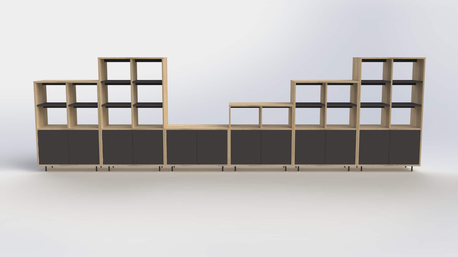 dividing low storage unit with two doors and with six open shelving sections, an MFC carcass, back panel to match the doors and black legs