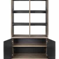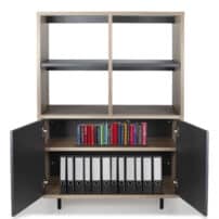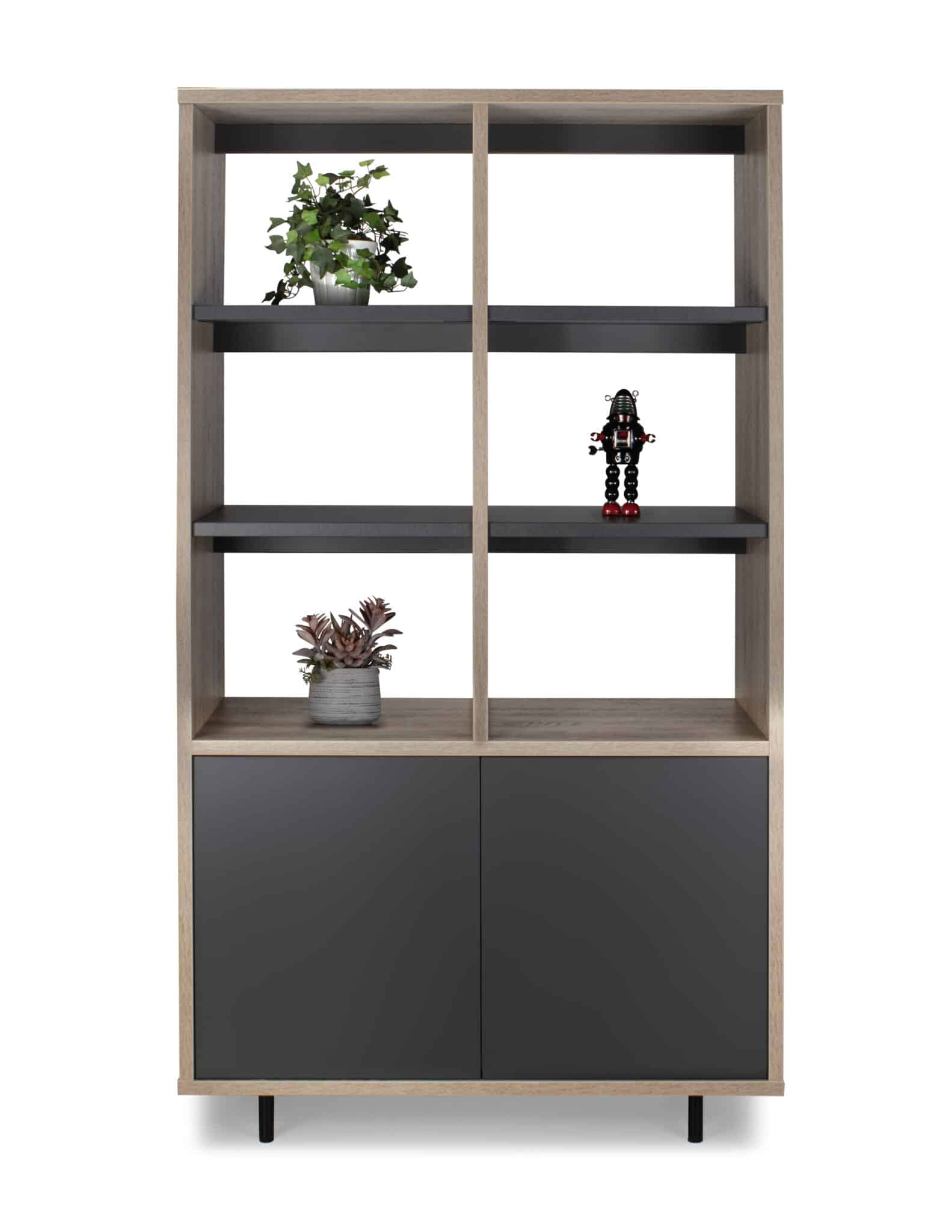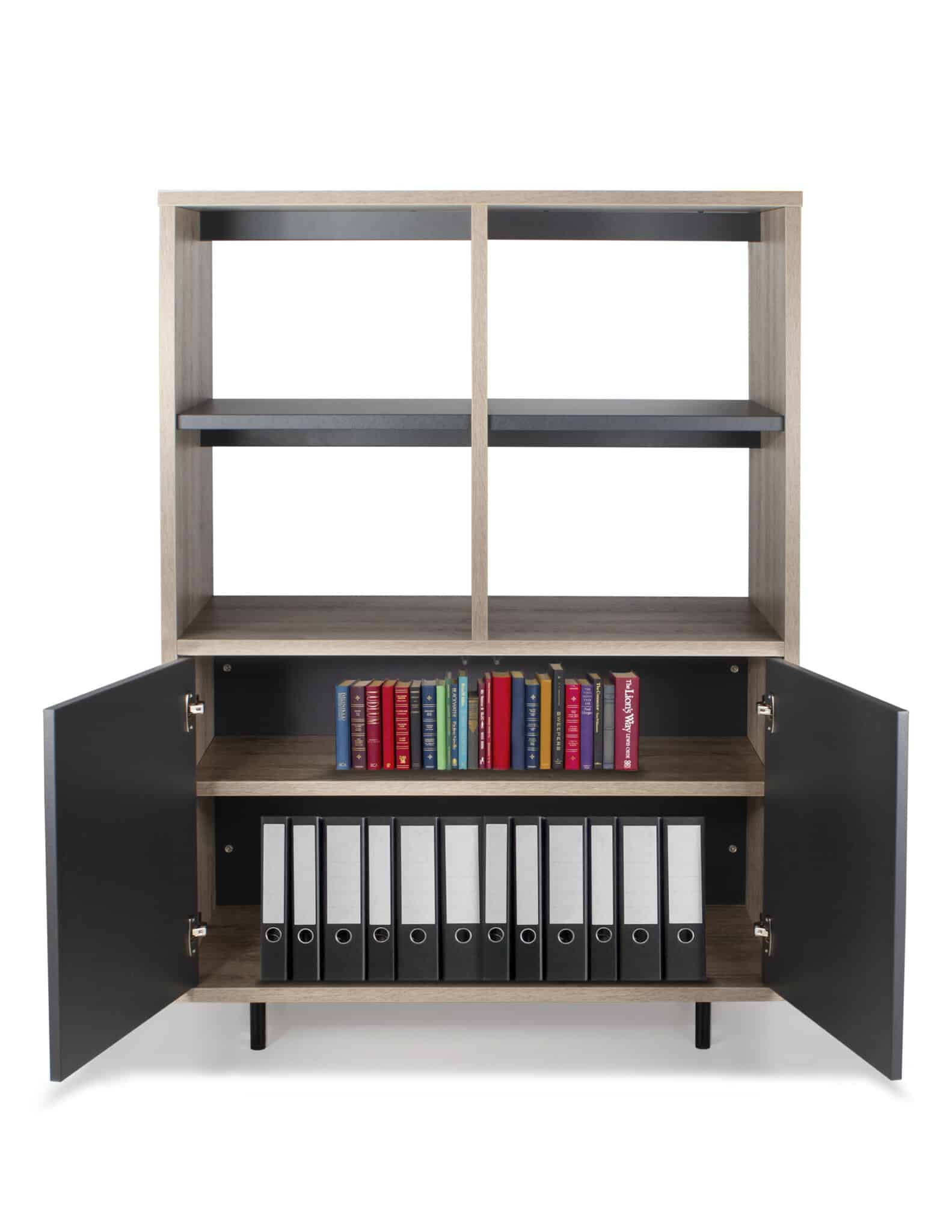dividing low storage unit with two doors and with four open shelving sections, an MFC carcass, back panel to match the doors and black legs