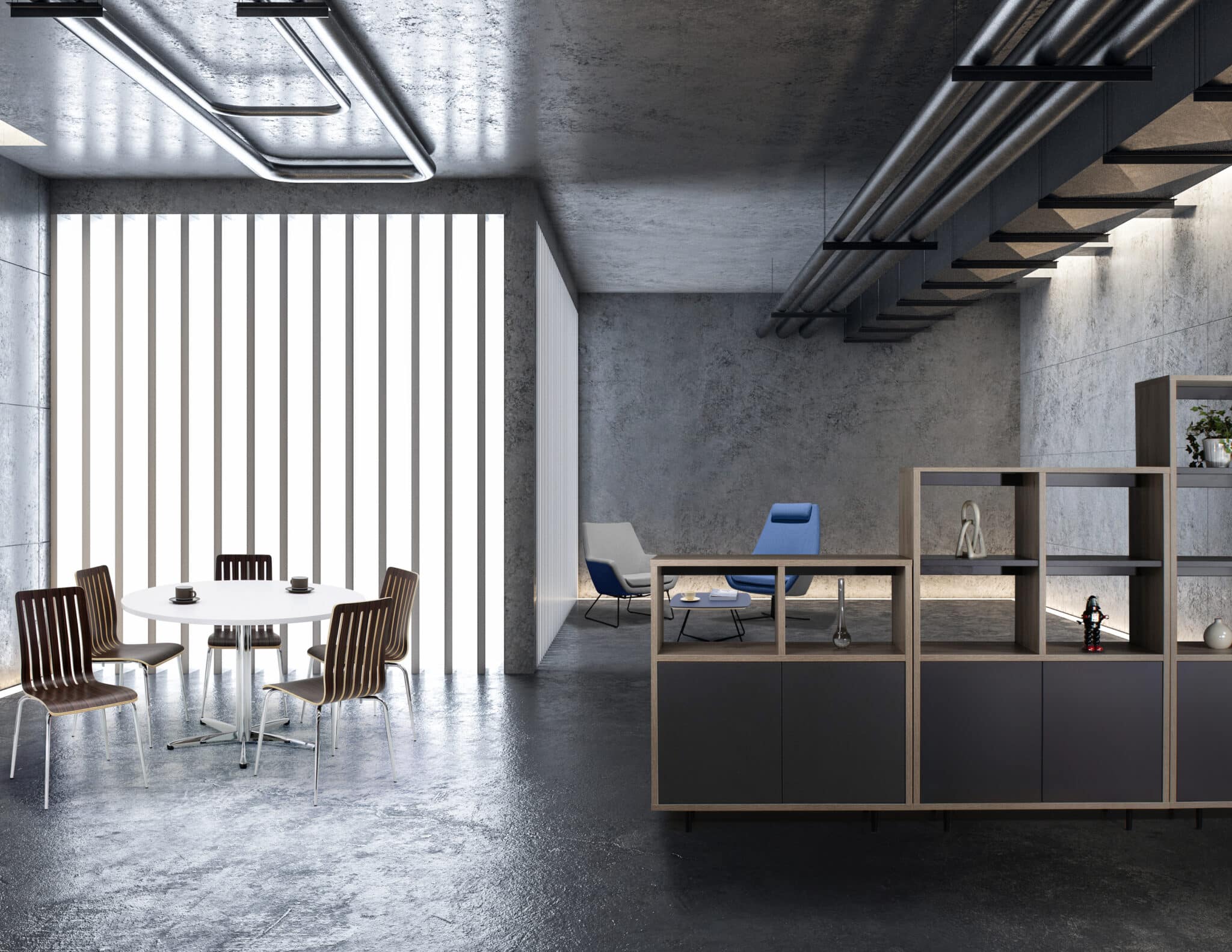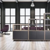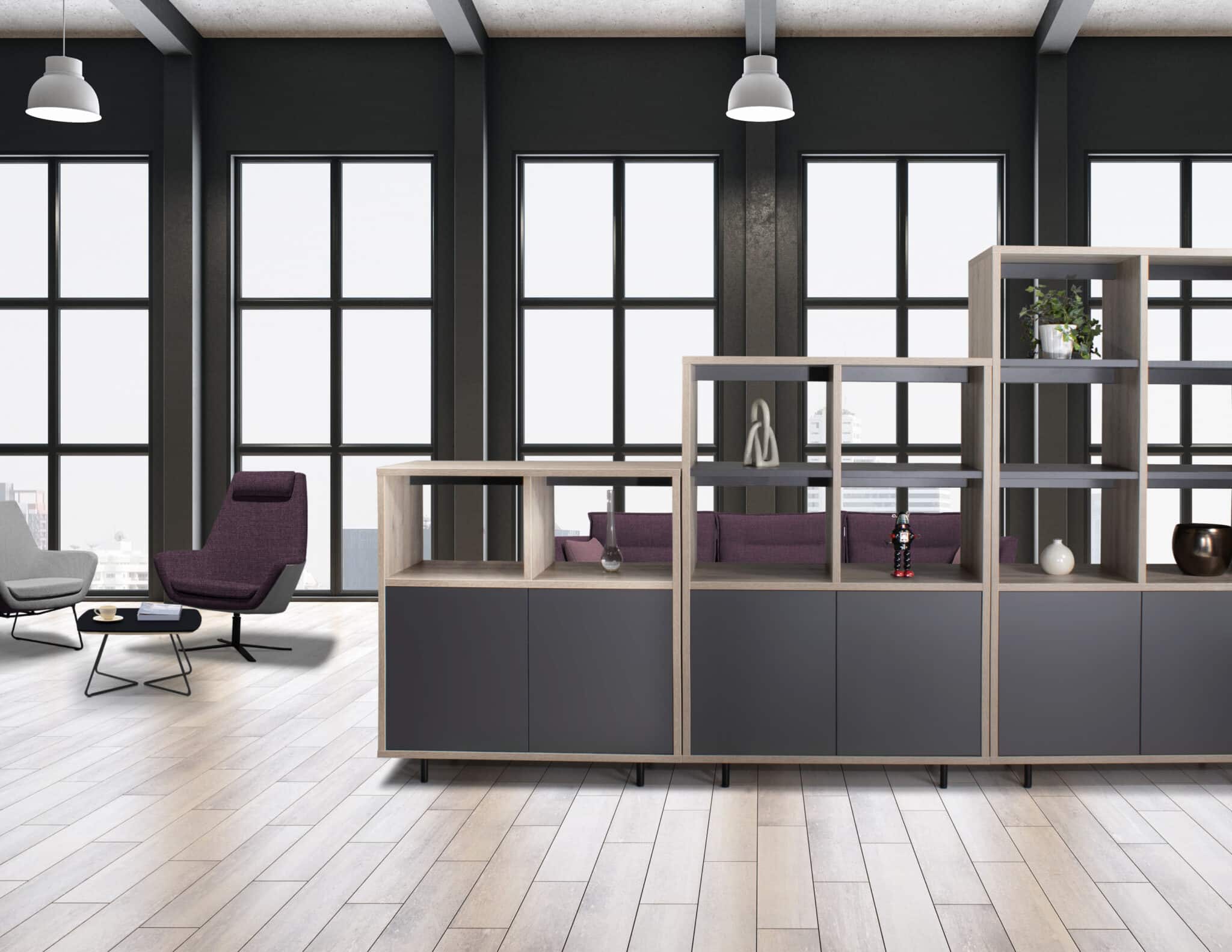 With flush-fitting, inset doors and touch-latch door closures these divider units are sleek in style and modern in character. All units feature a single adjustable shelf in the storage cupboard, with the possibility of open shelving above the closed